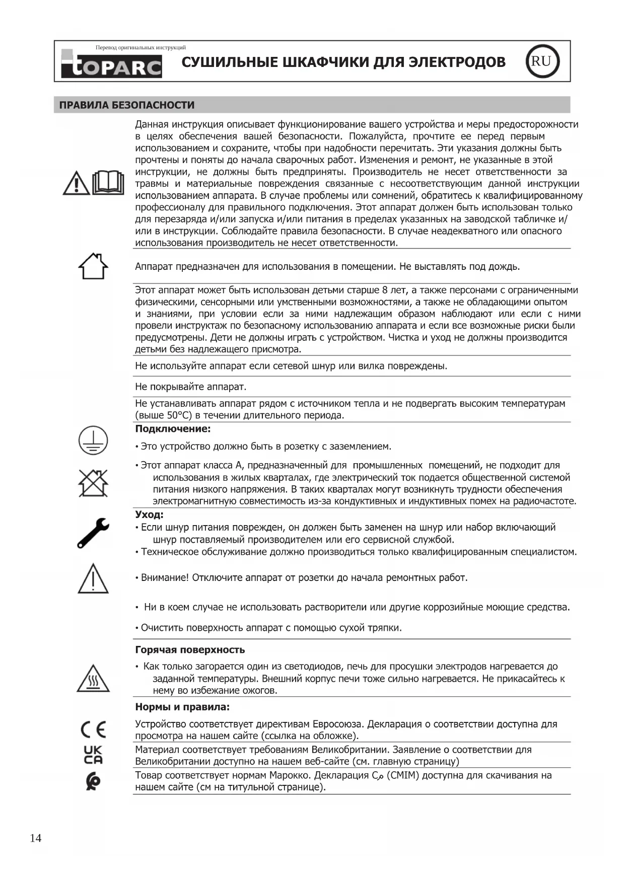 - Как только загорается один из светодиодов, печь для просушки электродов нагревается до заданной температуры. Внешний корпус печи тоже сильно нагревается. Не прикасайтесь к нему во избежание ожогов. Нормы и правила: Устройство соответствует директивам Евросоюза. Декларация о соответствии доступна для просмотра на нашем сайте (ссылка на обложке). Материал соответствует требованиям Великобритании. Заявление о соответствии для Великобритании доступно на нашем веб-сайте (см. главную страницу) Товар соответствует нормам Марокко. Декларация Cم (CMIM) доступна для скачивания на нашем сайте (см на титульной странице).Перевод оригинальных инструкций
