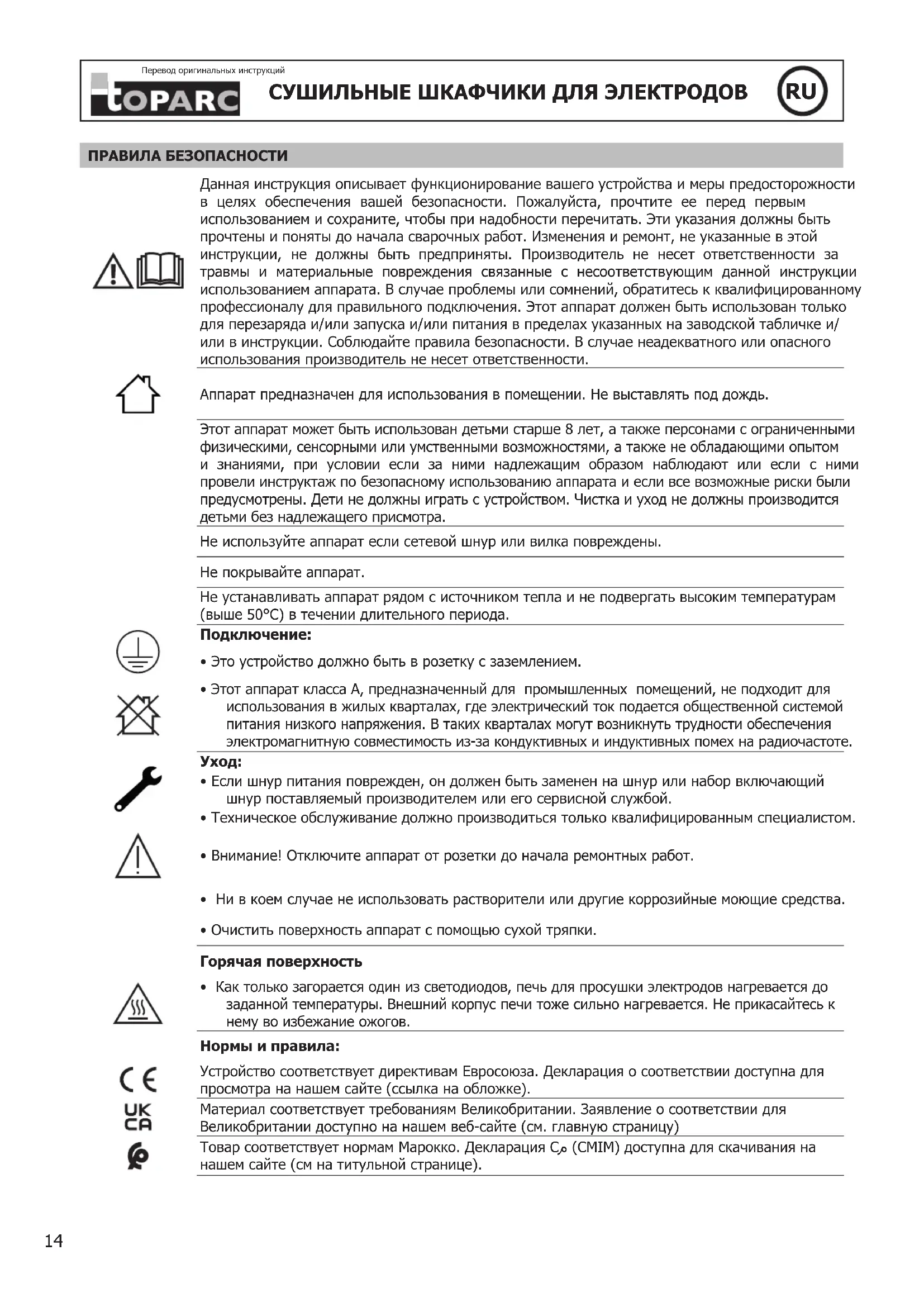 - Как только загорается один из светодиодов, печь для просушки электродов нагревается до заданной температуры. Внешний корпус печи тоже сильно нагревается. Не прикасайтесь к нему во избежание ожогов. Нормы и правила: Устройство соответствует директивам Евросоюза. Декларация о соответствии доступна для просмотра на нашем сайте (ссылка на обложке). Материал соответствует требованиям Великобритании. Заявление о соответствии для Великобритании доступно на нашем веб-сайте (см. главную страницу) Товар соответствует нормам Марокко. Декларация Cم (CMIM) доступна для скачивания на нашем сайте (см на титульной странице).Перевод оригинальных инструкций