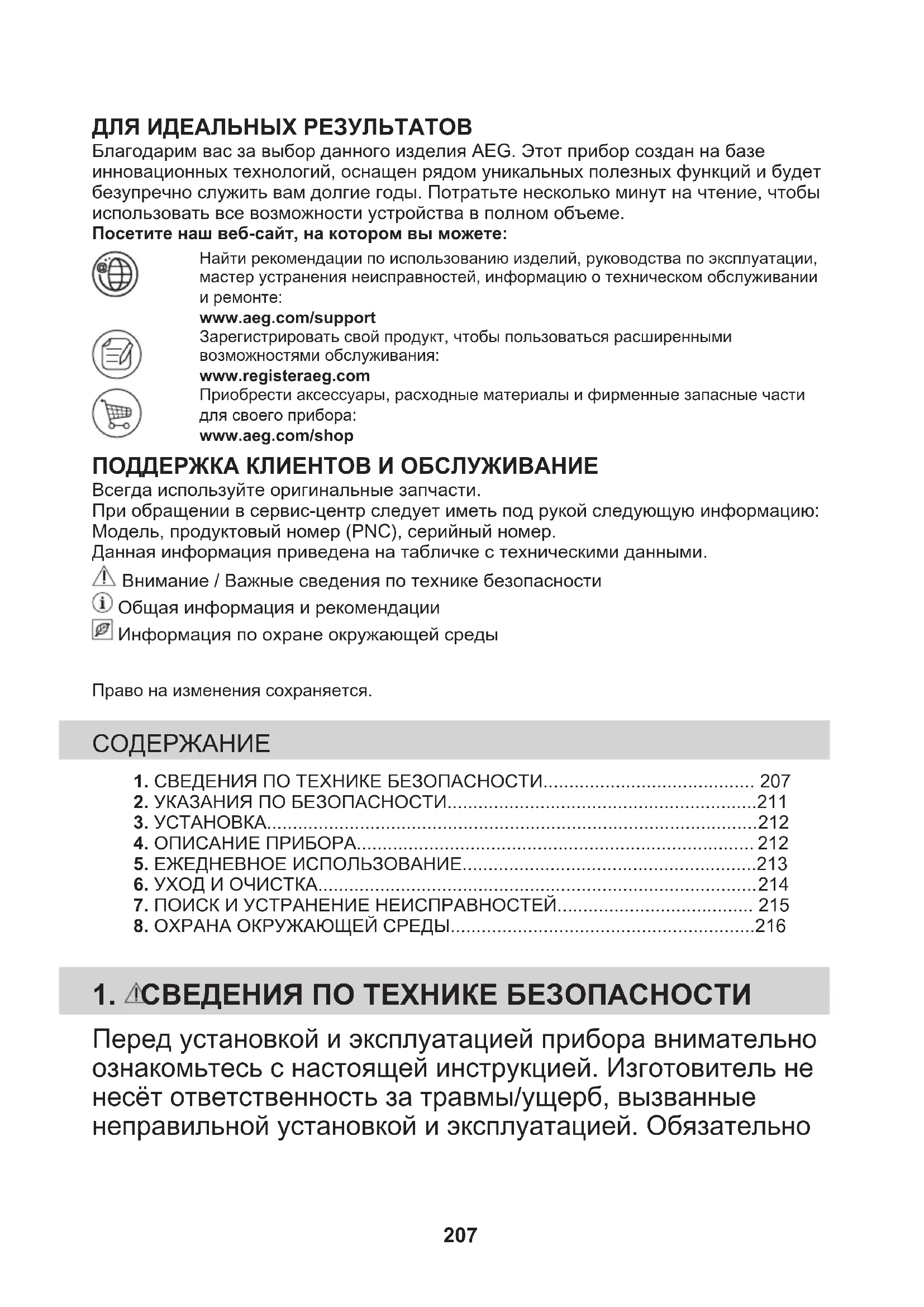 Reciclaţi materialele marcate cu simbolul . Pentru a recicla ambalajele, acestea trebuie puse în containerele corespunzătoare. Ajutaţi la protejarea mediului şi a sănătăţii umane şi la reciclarea deşeurilor din aparatele electrice şi electrocasnice. Nu aruncaţi aparatele marcate cu acest simbol împreună cu deşeurile menajere. Returnaţi produsul la centrul local de reciclare sau contactaţi administraţia oraşului dvs. 206ДЛЯ ИДЕАЛЬНЫХ РЕЗУЛЬТАТОВ Благодарим вас за выбор данного изделия AEG. Этот прибор создан на базеинновационных технологий, оснащен рядом уникальных полезных функций и будетбезупречно служить вам долгие годы. Потратьте несколько минут на чтение, чтобыиспользовать все возможности устройства в полном объеме.Посетите наш веб-сайт, на котором вы можете:Найти рекомендации по использованию изделий, руководства по эксплуатации,мастер устранения неисправностей, информацию о техническом обслуживаниии ремонте:www.aeg.com/supportЗарегистрировать свой продукт, чтобы пользоваться расширеннымивозможностями обслуживания:www.registeraeg.comПриобрести аксессуары, расходные материалы и фирменные запасные частидля своего прибора:www.aeg.com/shop ПОДДЕРЖКА КЛИЕНТОВ И ОБСЛУЖИВАНИЕ Всегда используйте оригинальные запчасти.При обращении в сервис-центр следует иметь под рукой следующую информацию:Модель, продуктовый номер (PNC), серийный номер.Данная информация приведена на табличке с техническими данными. Внимание / Важные сведения по технике безопасности Общая информация и рекомендации Информация по охране окружающей средыПраво на изменения сохраняется. 1. СВЕДЕНИЯ ПО ТЕХНИКЕ БЕЗОПАСНОСТИ......................................... 2072. УКАЗАНИЯ ПО БЕЗОПАСНОСТИ............................................................211