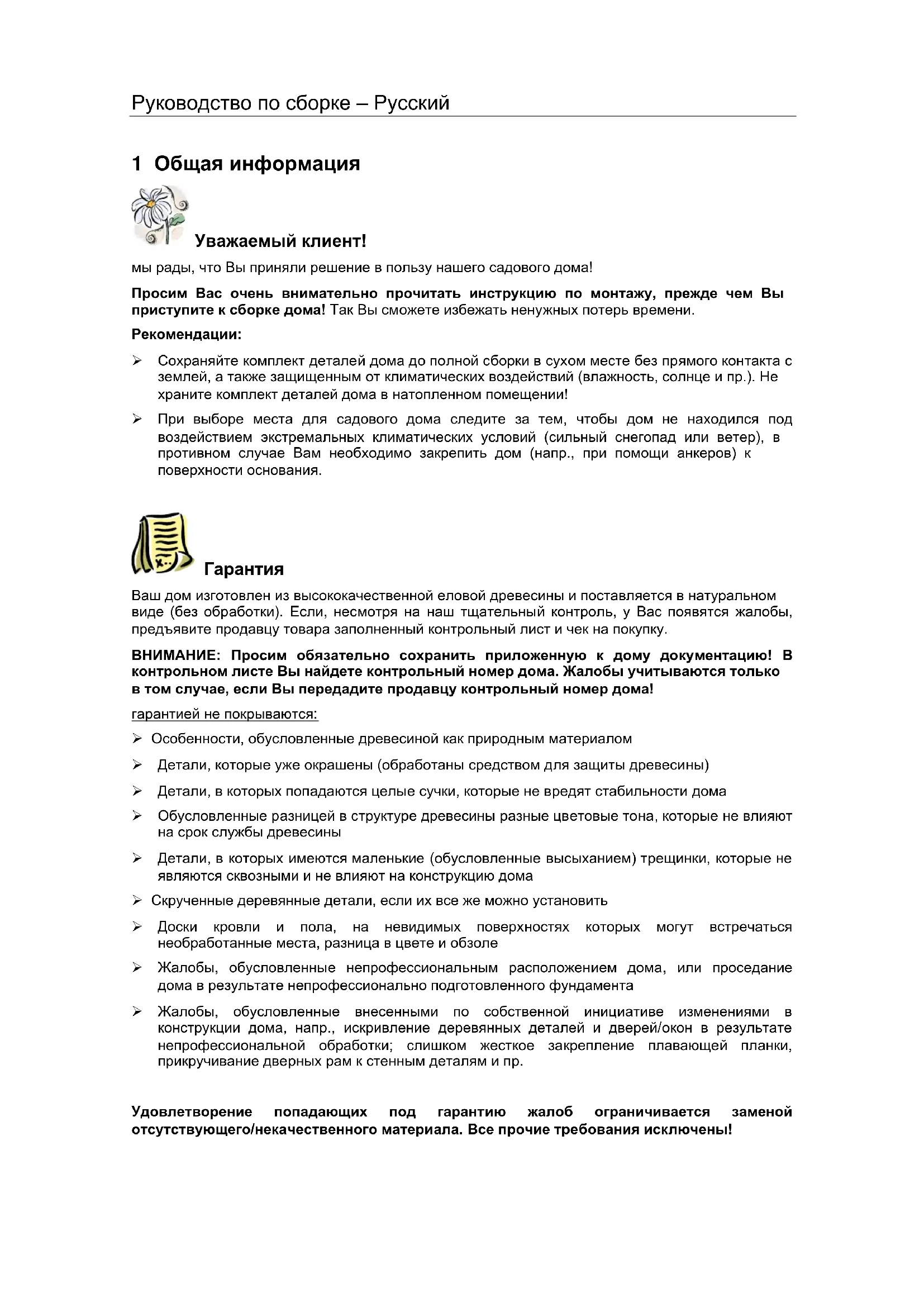 Ваш дом изготовлен из высококачественной еловой древесины и поставляется в натуральном виде (без обработки). Если, несмотря на наш тщательный контроль, у Вас появятся жалобы, предъявите продавцу товара заполненный контрольный лист и чек на покупку. ВНИМАНИЕ: Просим обязательно сохранить приложенную к дому документацию! В контрольном листе Вы найдете контрольный номер дома. Жалобы учитываются только в том случае, если Вы передадите продавцу контрольный номер дома! гарантией не покрываются: ➢ Особенности, обусловленные древесиной как природным материалом ➢ Детали, которые уже окрашены (обработаны средством для защиты древесины) ➢ Детали, в которых попадаются целые сучки, которые не вредят стабильности дома ➢ Обусловленные разницей в структуре древесины разные цветовые тона, которые не влияют на срок службы древесины ➢ Детали, в которых имеются маленькие (обусловленные высыханием) трещинки, которые не являются сквозными и не влияют на конструкцию дома ➢ Скрученные деревянные детали, если их все же можно установить ➢ Доски кровли и пола, на невидимых поверхностях которых могут встречаться необработанные места, разница в цвете и обзоле ➢ Жалобы, обусловленные непрофессиональным расположением дома, или проседание дома в результате непрофессионально подготовленного фундамента ➢ Жалобы, обусловленные внесенными по собственной инициативе изменениями в конструкции дома, напр., искривление деревянных деталей и дверей/окон в результате непрофессиональной обработки; слишком жесткое закрепление плавающей планки, прикручивание дверных рам к стенным деталям и пр. Удовлетворение попадающих под гарантию жалоб ограничивается заменой отсутствующего/некачественного материала. Все прочие требования исключены!Руководство по сборке – Русский