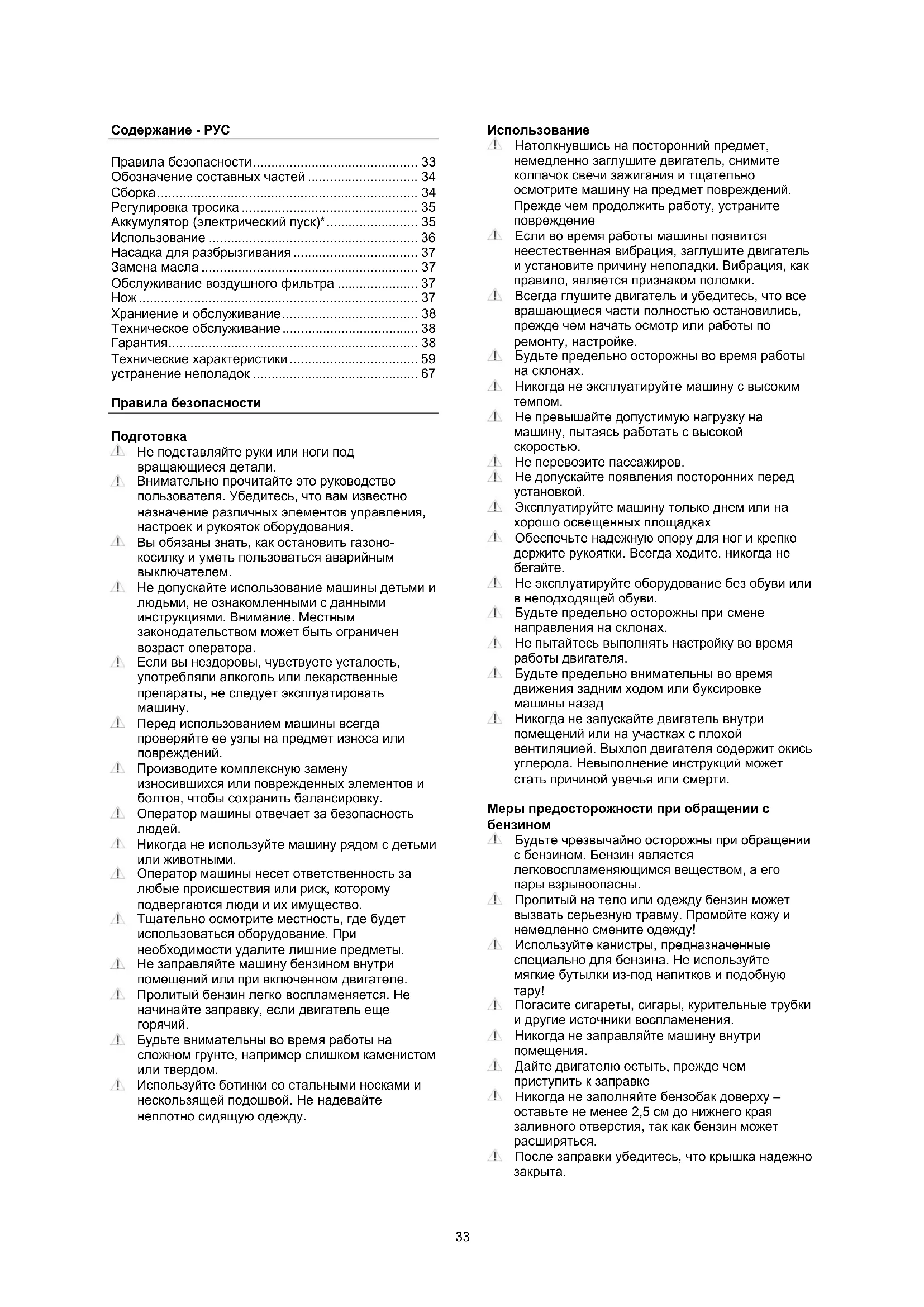Не эксплуатируйте оборудование без обуви или в неподходящей обуви. Будьте предельно осторожны при смене направления на склонах. Не пытайтесь выполнять настройку во время работы двигателя. Будьте предельно внимательны во время движения задним ходом или буксировке машины назад Никогда не запускайте двигатель внутри помещений или на участках с плохой вентиляцией. Выхлоп двигателя содержит окись углерода. Невыполнение инструкций может стать причиной увечья или смерти. Меры предосторожности при обращении с