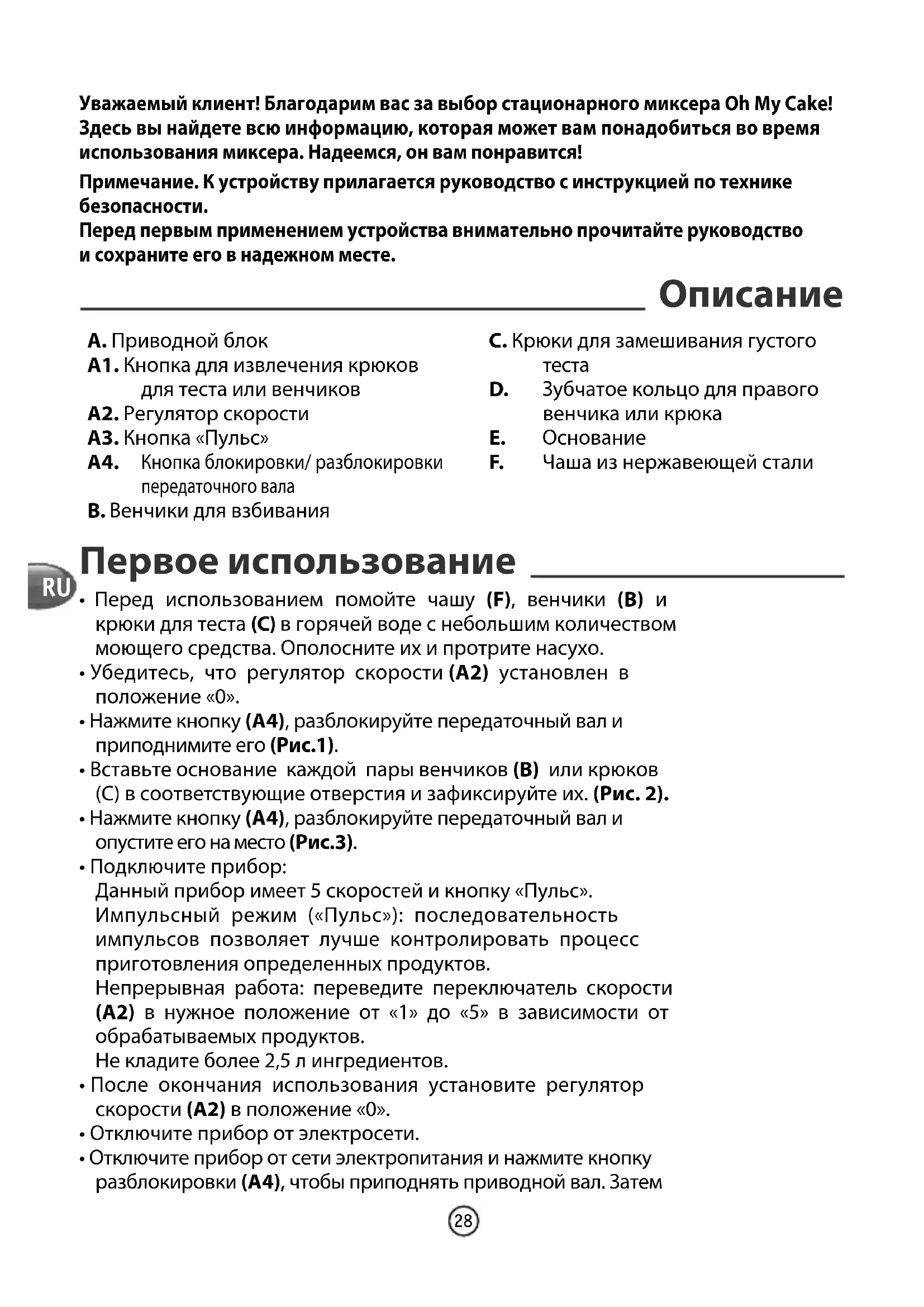 Примечание. К устройству прилагается руководство с инструкцией по технике безопасности. Перед первым применением устройства внимательно прочитайте руководство и сохраните его в надежном месте. Уважаемый клиент! Благодарим вас за выбор стационарного миксера Oh My Cake! Здесь вы найдете всю информацию, которая может вам понадобиться во время использования миксера. Надеемся, он вам понравится! A. Приводной блок A1. Кнопка для извлечения крюков для теста или венчиков A2. Регулятор скорости A3. Кнопка «Пульс» A4. Кнопка блокировки/ разблокировки передаточного вала B. Венчики для взбивания C. Крюки для замешивания густого