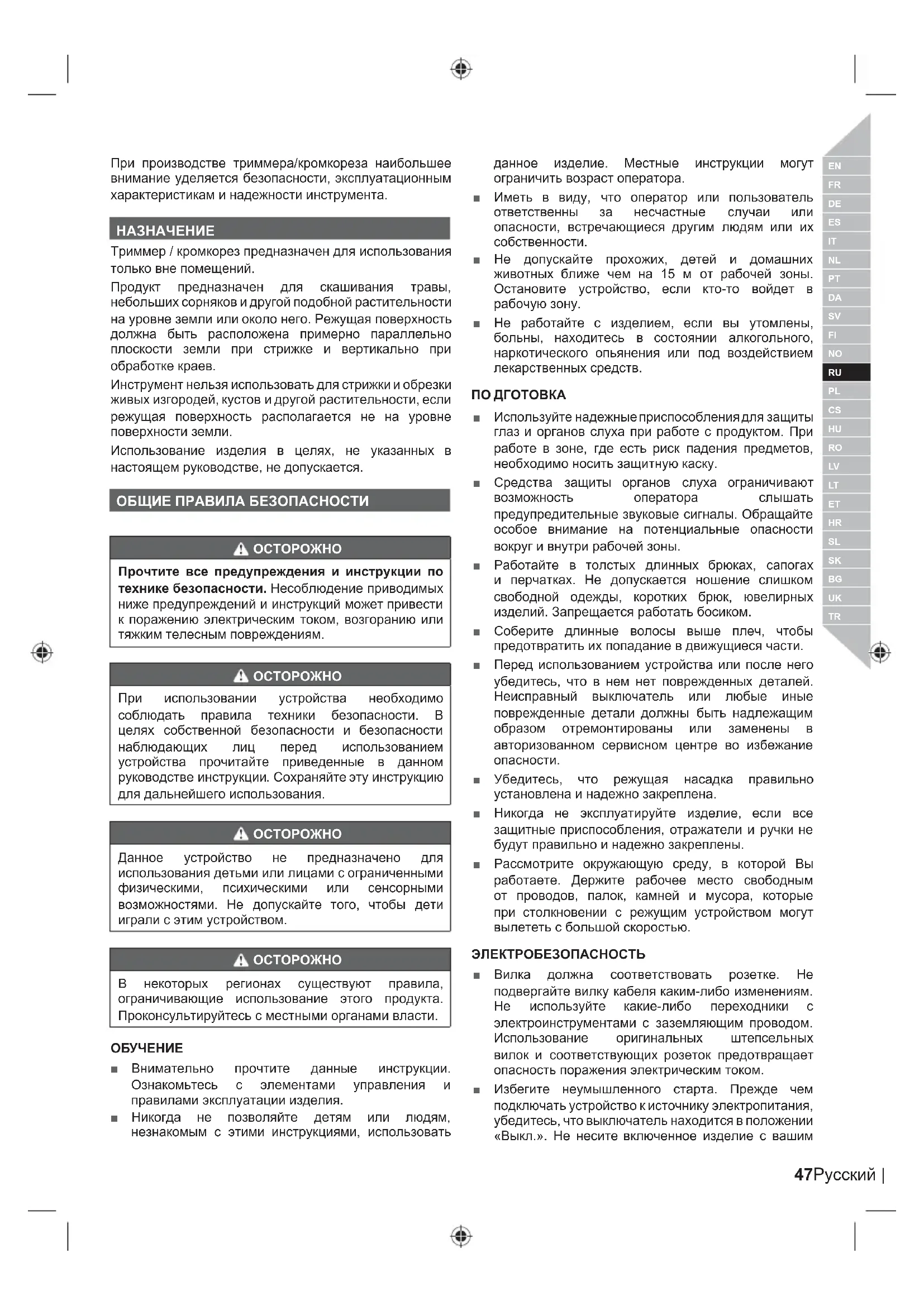 МЕРЫ ПРЕДОСТОРОЖНОСТИ ПРИ ИСПОЛЬЗОВАНИИ ТРИММЕРА / КРОМКОРЕЗА ■ Не допускайте к работе с данным устройством детей и лиц, незнакомых с инструкциями по использованию изделия. ■ Используйте изделие при дневном свете или хорошем искусственном освещении. ■ Не используйте устройство для стрижки влажной