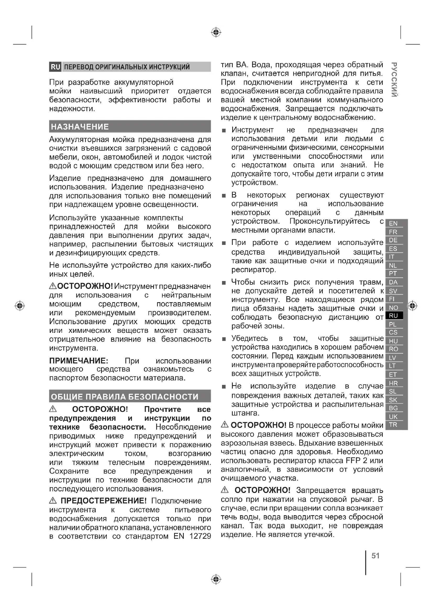 , распылении бытовых чистящих и дезинфицирующих средств. Не используйте устройство для каких-либо иных целей. ОСТОРОЖНО! Инструмент предназначен для использования с нейтральным моющим средством, поставляемым или рекомендуемым производителем. Использование других моющих средств или химических веществ может оказать отрицательное влияние на безопасность инструмента. ПРИМЕЧАНИЕ: При использовании моющего средства ознакомьтесь с паспортом безопасности материала. ОБЩИЕ ПРАВИЛА БЕЗОПАСНОСТИ ОСТОРОЖНО! Прочтите все предупреждения и инструкции по технике безопасности. Несоблюдение приводимых ниже предупреждений и инструкций может привести к поражению электрическим током, возгоранию или тяжким телесным повреждениям. Сохраните все предупреждения и инструкции по технике безопасности для последующего использования. ПРЕДОСТЕРЕЖЕНИЕ! Подключение инструмента к системе питьевого водоснабжения допускается только при наличии обратного клапана, установленного в соответствии со стандартом EN 12729 тип BA. Вода, проходящая через обратный клапан, считается непригодной для питья. При подключении инструмента к сети водоснабжения всегда соблюдайте правила вашей местной компании коммунального водоснабжения. Запрещается подключать изделие к центральному водоснабжению. ■ Инструмент не предназначен для использования детьми или людьми с ограниченными физическими, сенсорными или умственными способностями или с недостатком опыта или знаний. Не допускайте того, чтобы дети играли с этим устройством. ■ В некоторых регионах существуют ограничения на использование некоторых операций с данным устройством. Проконсультируйтесь с местными органами власти. ■ При работе с изделием используйте средства индивидуальной защиты, такие как защитные очки и подходящий респиратор. ■ Чтобы снизить риск получения травм, не допускайте детей и посетителей к инструменту. Все находящиеся рядом лица обязаны надеть защитные очки и соблюдать безопасную дистанцию от рабочей зоны. ■ Убедитесь в том, чтобы защитные устройства находились в хорошем рабочем состоянии. Перед каждым использованием инструмента проверяйте работоспособность всех защитных устройств. ■ Не используйте изделие в случае повреждения важных деталей, таких как защитные устройства и распылительная