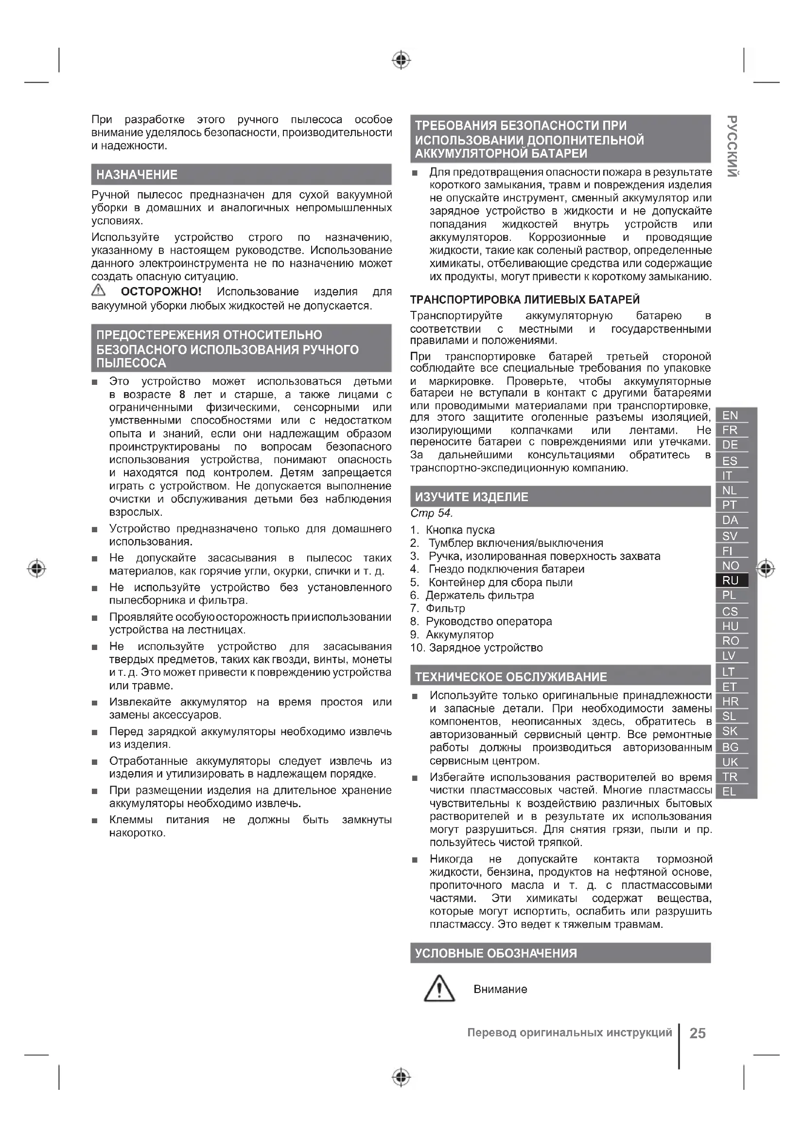 Oversettelse av de originale instruksjoneneПри разработке этого ручного пылесоса особое внимание уделялось безопасности, производительности и надежности.
