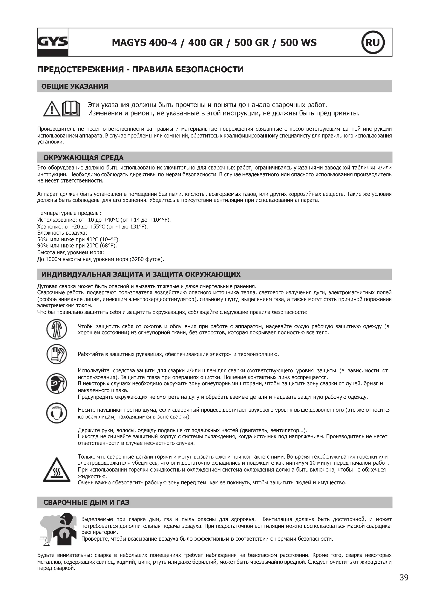 РУКОВОДСТВО ПОЛЬЗОВАТЕЛЯ Magys 500 WS GYS