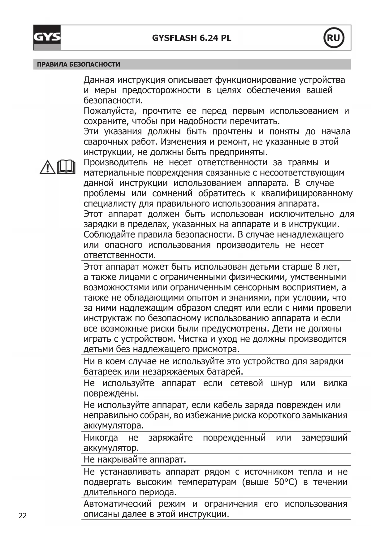 ПРАВИЛА БЕЗОПАСНОСТИ Данная инструкция описывает функционирование устройства и меры предосторожности в целях обеспечения вашей безопасности. Пожалуйста, прочтите ее перед первым использованием и сохраните, чтобы при надобности перечитать. Эти указания должны быть прочтены и поняты до начала сварочных работ. Изменения и ремонт, не указанные в этой инструкции, не должны быть предприняты. Производитель не несет ответственности за травмы и материальные повреждения связанные с несоответствующим данной инструкции использованием аппарата. В случае проблемы или сомнений обратитесь к квалифицированному специалисту для правильного использования аппарата. Этот аппарат должен быть использован исключительно для зарядки в пределах, указанных на аппарате и в инструкции. Соблюдайте правила безопасности. В случае ненадлежащего или опасного использования производитель не несет ответственности. Этот аппарат может быть использован детьми старше 8 лет, а также лицами с ограниченными физическими, умственными возможностями или ограниченным сенсорным восприятием, а также не обладающими опытом и знаниями, при условии, что за ними надлежащим образом следят или если с ними провели инструктаж по безопасному использованию аппарата и если все возможные риски были предусмотрены. Дети не должны играть с устройством. Чистка и уход не должны производится детьми без надлежащего присмотра. Ни в коем случае не используйте это устройство для зарядки батареек или незаряжаемых батарей. Не используйте аппарат если сетевой шнур или вилка повреждены. Не используйте аппарат, если кабель заряда поврежден или неправильно собран, во избежание риска короткого замыкания аккумулятора. Никогда не заряжайте поврежденный или замерзший аккумулятор. Не накрывайте аппарат. Не устанавливать аппарат рядом с источником тепла и не подвергать высоким температурам (выше 50°C) в течении длительного периода. Автоматический режим и ограничения его использования описаны далее в этой инструкции.23 GYSFLASH 6.24 PL