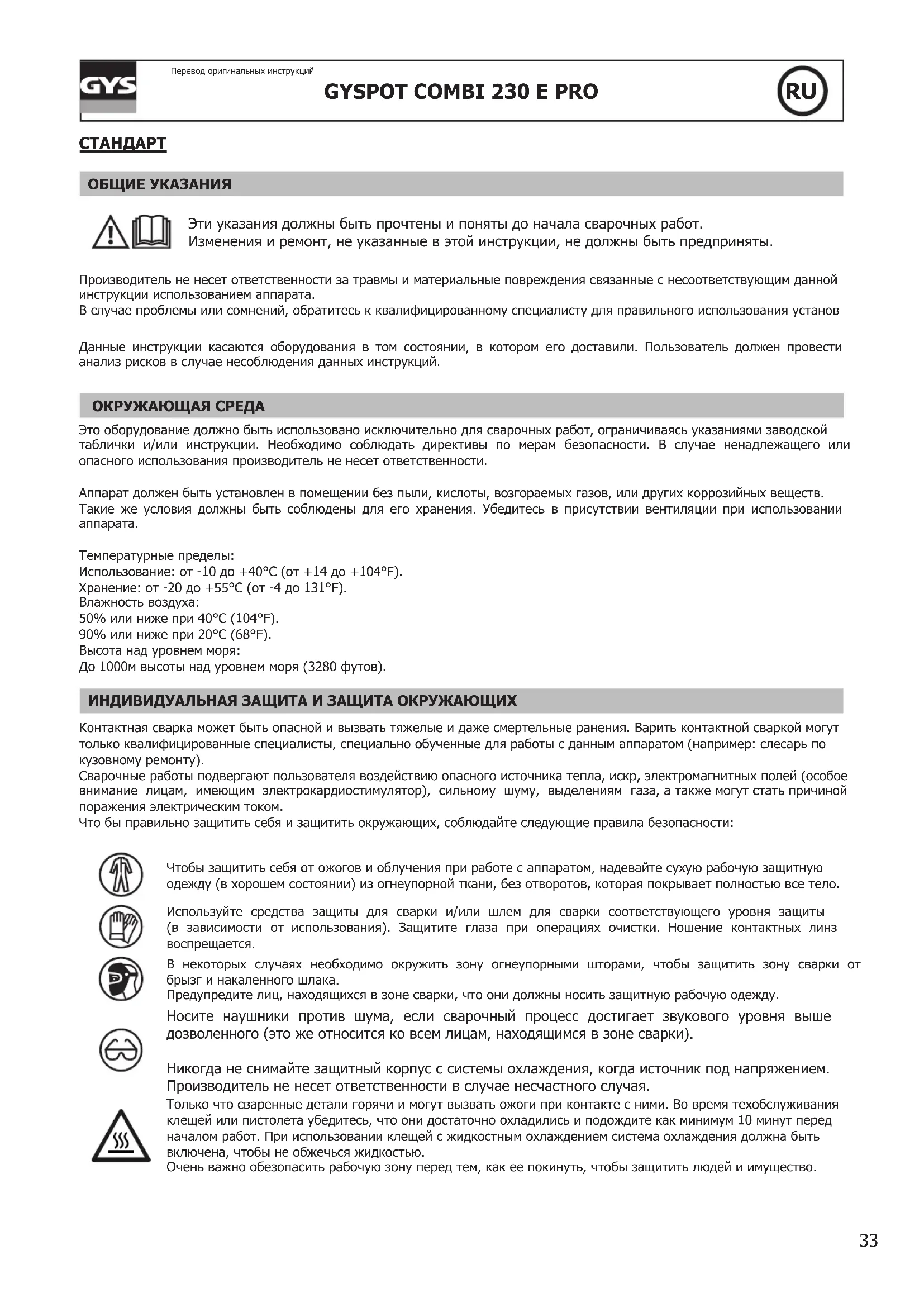 РУКОВОДСТВО ПОЛЬЗОВАТЕЛЯ Gyspot Combi 230 E PRO GYS