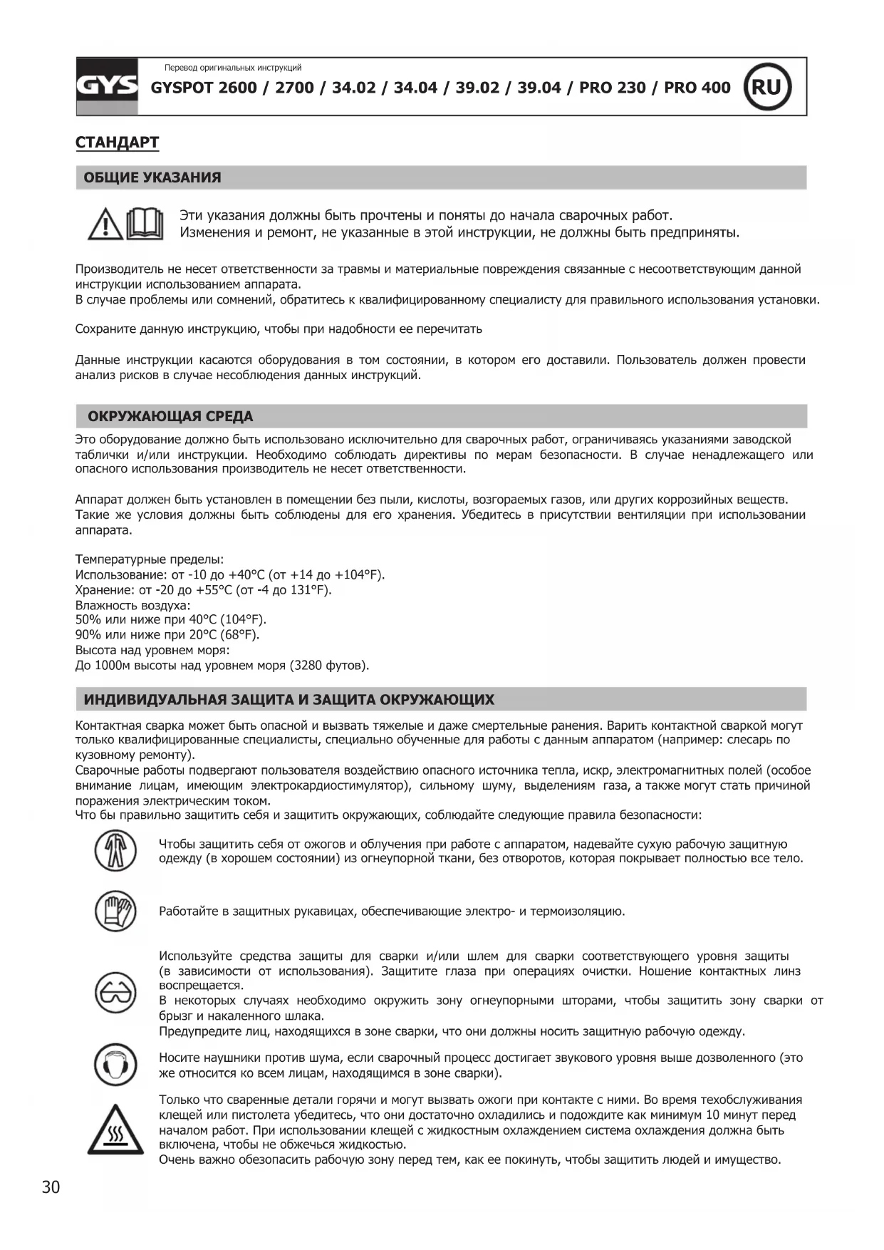 СВАРОЧНЫЕ ДЫМ И ГАЗ Выделяемые при сварке дым, газ и пыль опасны для здоровья. Вентиляция должна быть достаточной, и может потребоваться дополнительная подача воздуха. При недостаточной вентиляции можно воспользоваться маской сварщика-респиратором. Проверьте, чтобы всасывание воздуха было эффективным в соответствии с нормами безопасности. Будьте внимательны: сварка в небольших помещениях требует наблюдения на безопасном расстоянии. Кроме того, сварка некоторых металлов, содержащих свинец, кадмий, цинк, ртуть или даже бериллий, может быть чрезвычайно вредной. Очистите от жира детали перед сваркой. Ни в коем случае не варить вблизи жира или краски. РИСК ПОЖАРА И ВЗРЫВА Полностью защитите зону сварки. Возгораемые материалы должны быть удалены как минимум на 11 метров. Противопожарное оборудование должно находиться вблизи проведения сварочных работ. Берегитесь брызг горячего материала или искр, т.к. они могут вызвать пожар или взрыв даже через щели. Удалите людей, возгораемые предметы и все емкости под давлением на безопасное расстояние. Ни в коем случае не варите в контейнерах или закрытых трубах. В случае, если они открыты, то перед сваркой их нужно освободить от всех взрывчатых или возгораемых веществ (масло, топливо, остаточные газы …). Во время операции шлифования не направляйте инструмент в сторону источника сварочного тока или возгораемых материалов. ЭЛЕКТРИЧЕСКАЯ БЕЗОПАСНОСТЬ Используемая электрическая сеть должна обязательно быть заземленной. Электрический разряд может вызвать прямые или косвенные ранения, и даже смерть. Никогда не дотрагивайтесь до частей под напряжением как внутри, так и снаружи источника (кабели, электроды, плечи, пистолет...), т.к. они подключены к сварочной цепи. Перед тем, как открыть источник, его нужно отключить от сети и подождать 2 минуты для того, чтобы все конденсаторы разрядились. Если кабели, электроды или плечи повреждены, попросите квалифицированных и уполномоченных специалистов их заменить. Размеры сечения кабелей должны соответствовать применению. Всегда носите сухую одежду в хорошем состоянии для изоляции от сварочной цепи. Носите изолирующую обувь независимо от той среды, где вы работаете. КЛАССИФИКАЦИЯ ЭЛЕКТРОМАГНИТНОЙ СОВМЕСТИМОСТИ Это оборудование класса A не подходит для использования в жилых кварталах, где электрический ток подается общественной системой питания низкого напряжения. В таких кварталах могут возникнуть трудности обеспечения электромагнитную совместимость из-за кондуктивных и индуктивных помех на радиочастоте. GYSPOT2600 / 2700 / 34.04 / 39.04 / PRO 400 Это оборудование соответствует норме CEI 61000-3-11, если полное сопротивление сети в месте подключения к электрической установке меньше, чем максимально допустимое полное сопротивление сети Zmax = 0,77 Oм. GYSPOT34.02 / 39.02 /PRO 230 Это оборудование соответствует норме CEI 61000-3-11, если полное сопротивление сети в месте подключения к электрической установке меньше, чем максимально допустимое полное сопротивление сети Zmax = 0,84 Oм. Этот аппарат не соответствует директиве CEI 61000-3-12 и предназначен для работы от частных электросетей, подведенных к общественным электросетям только среднего и высокого напряжения. Специалист, установивший аппарат, или пользователь, должны убедиться, обратившись при надобности к организации, отвечающей за эксплуа
