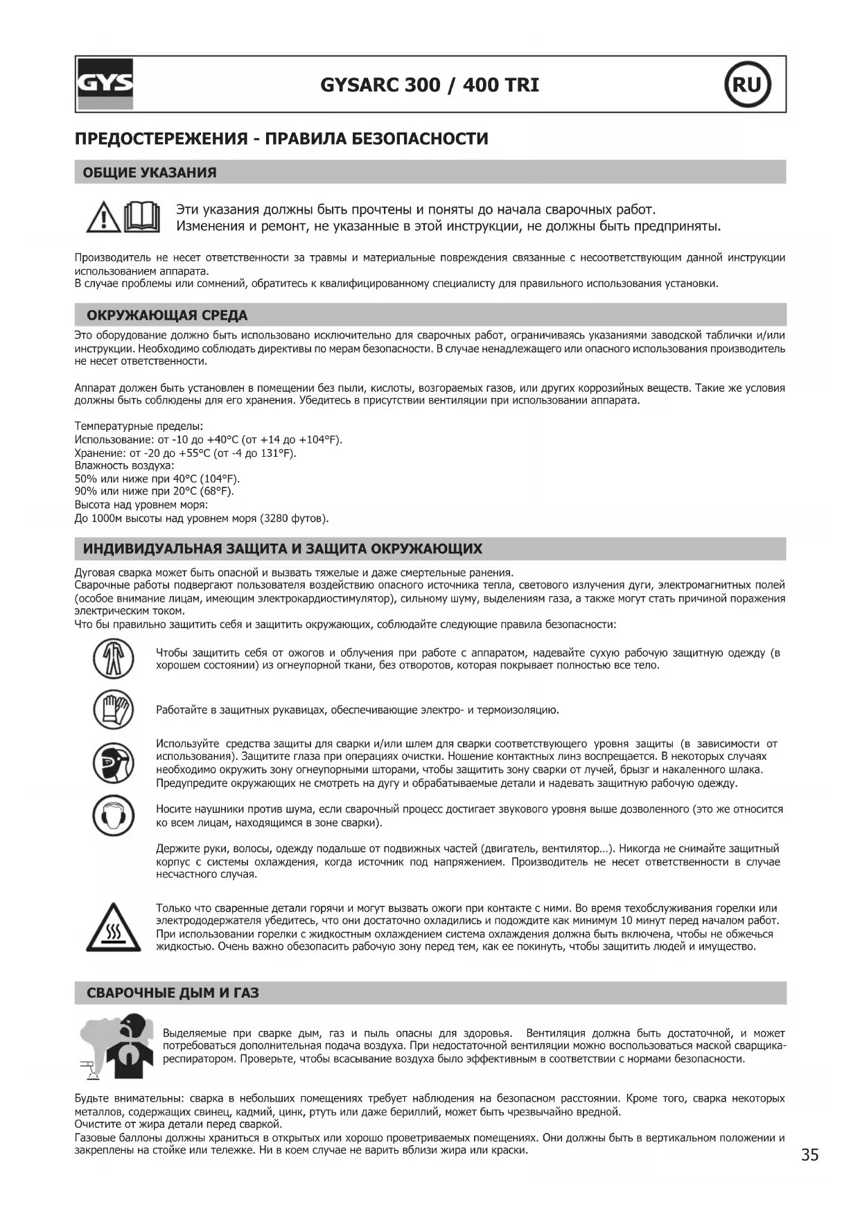 ПРЕДОСТЕРЕЖЕНИЯ - ПРАВИЛА БЕЗОПАСНОСТИ ОБЩИЕ УКАЗАНИЯ Эти указания должны быть прочтены и поняты до начала сварочных работ. Изменения и ремонт, не указанные в этой инструкции, не должны быть предприняты. Производитель не несет ответственности за травмы и материальные повреждения связанные с несоответствующим данной инструкции использованием аппарата. В случае проблемы или сомнений, обратитесь к квалифицированному специалисту для правильного использования установки. ОКРУЖАЮЩАЯ СРЕДА Это оборудование должно быть использовано исключительно для сварочных работ, ограничиваясь указаниями заводской таблички и/или инструкции. Необходимо соблюдать директивы по мерам безопасности. В случае ненадлежащего или опасного использования производитель не несет ответственности. Аппарат должен быть установлен в помещении без пыли, кислоты, возгораемых газов, или других коррозийных веществ. Такие же условия должны быть соблюдены для его хранения. Убедитесь в присутствии вентиляции при использовании аппарата. Температурные пределы: Использование: от -10 до +40°C (от +14 до +104°F). Хранение: от -20 до +55°C (от -4 до 131°F). Влажность воздуха: 50% или ниже при 40°C (104°F). 90% или ниже при 20°C (68°F). Высота над уровнем моря: До 1000м высоты над уровнем моря (3280 футов). ИНДИВИДУАЛЬНАЯ ЗАЩИТА И ЗАЩИТА ОКРУЖАЮЩИХ Дуговая сварка может быть опасной и вызвать тяжелые и даже смертельные ранения. Сварочные работы подвергают пользователя воздействию опасного источника тепла, светового излучения дуги, электромагнитных полей (особое внимание лицам, имеющим электрокардиостимулятор), сильному шуму, выделениям газа, а также могут стать причиной поражения электрическим током. Что бы правильно защитить себя и защитить окружающих, соблюдайте следующие правила безопасности: Чтобы защитить себя от ожогов и облучения при работе с аппаратом, надевайте сухую рабочую защитную одежду (в хорошем состоянии) из огнеупорной ткани, без отворотов, которая покрывает полностью все тело. Работайте в защитных рукавицах, обеспечивающие электро- и термоизоляцию. Используйте средства защиты для сварки и/или шлем для сварки соответствующего уровня защиты (в зависимости от использования). Защитите глаза при операциях очистки. Ношение контактных линз воспрещается. В некоторых случаях необходимо окружить зону огнеупорными шторами, чтобы защитить зону сварки от лучей, брызг и накаленного шлака. Предупредите окружающих не смотреть на дугу и обрабатываемые детали и надевать защитную рабочую одежду. Носите наушники против шума, если сварочный процесс достигает звукового уровня выше дозволенного (это же относится ко всем лицам, находящимся в зоне сварки). Держите руки, волосы, одежду подальше от подвижных частей (двигатель, вентилятор…). Никогда не снимайте защитный корпус с системы охлаждения, когда источник под напряжением. Производитель не несет ответственности в случае несчастного случая. Только что сваренные детали горячи и могут вызвать ожоги при контакте с ними. Во время техобслуживания горелки или электрододержателя убедитесь, что они достаточно охладились и подождите как минимум 10 минут перед началом работ. При использовании горелки с жидкостным охлаждением система охлаждения должна быть включена, чтобы не обжечься жидкостью. Очень важно обезопасить рабочую зону перед тем, как ее 