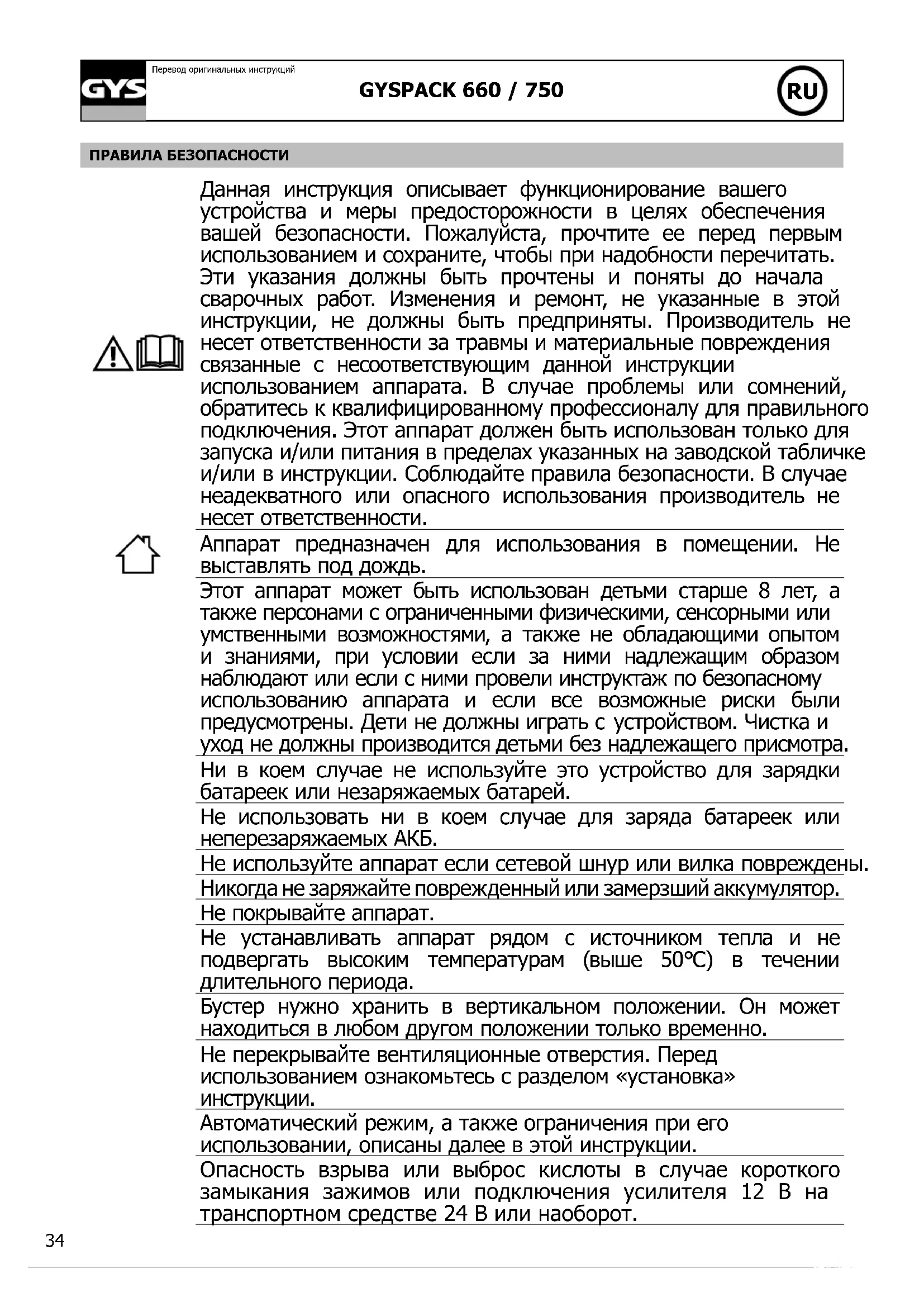 Перевод оригинальных инструкций ПРАВИЛА БЕЗОПАСНОСТИ Данная инструкция описывает функционирование вашего устройства и меры предосторожности в целях обеспечения вашей безопасности. Пожалуйста, прочтите ее перед первым использованием и сохраните, чтобы при надобности перечитать. Эти указания должны быть прочтены и поняты до начала сварочных работ. Изменения и ремонт, не указанные в этой инструкции, не должны быть предприняты. Производитель не несет ответственности за травмы и материальные повреждения связанные с несоответствующим данной инструкции использованием аппарата. В случае проблемы или сомнений, обратитесь к квалифицированному профессионалу для правильного подключения. Этот аппарат должен быть использован только для запуска и/или питания в пределах указанных на заводской табличке и/или в инструкции. Соблюдайте правила безопасности. В случае неадекватного или опасного использования производитель не несет ответственности. Аппарат предназначен для использования в помещении. Не выставлять под дождь. Этот аппарат может быть использован детьми старше 8 лет, а также персонами с ограниченными физическими, сенсорными или умственными возможностями, а также не обладающими опытом и знаниями, при условии если за ними надлежащим образом наблюдают или если с ними провели инструктаж по безопасному использованию аппарата и если все возможные риски были предусмотрены. Дети не должны играть с устройством. Чистка и уход не должны производится детьми без надлежащего присмотра. Ни в коем случае не используйте это устройство для зарядки батареек или незаряжаемых батарей. Не использовать ни в коем случае для заряда батареек или неперезаряжаемых АКБ. Не используйте аппарат если сетевой шнур или вилка повреждены. Никогда не заряжайте поврежденный или замерзший аккумулятор. Не покрывайте аппарат. Не устанавливать аппарат рядом с источником тепла и не подвергать высоким температурам (выше 50°C) в течении длительного периода. Бустер нужно хранить в вертикальном положении. Он может находиться в любом другом положении только временно. Не перекрывайте вентиляционные отверстия. Перед использованием ознакомьтесь с разделом «установка» инструкции. Автоматический режим, а также ограничения при его использовании, описаны далее в этой инструкции. Опасность взрыва или выброс кислоты в случае короткого замыкания зажимов или подключения усилителя 12 В на транспортном средстве 24 В или наоборот.GYSPACK 660 / 750
