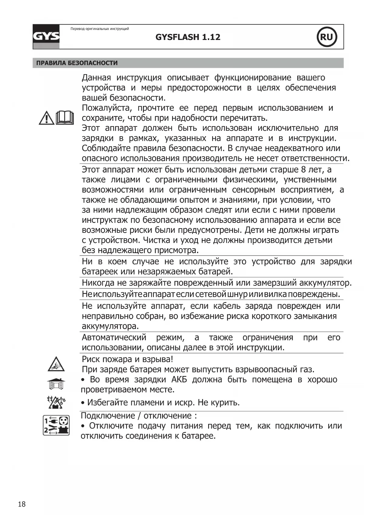 ПРАВИЛА БЕЗОПАСНОСТИ Данная инструкция описывает функционирование вашего устройства и меры предосторожности в целях обеспечения вашей безопасности. Пожалуйста, прочтите ее перед первым использованием и сохраните, чтобы при надобности перечитать. Этот аппарат должен быть использован исключительно для зарядки в рамках, указанных на аппарате и в инструкции. Соблюдайте правила безопасности. В случае неадекватного или опасного использования производитель не несет ответственности. Этот аппарат может быть использован детьми старше 8 лет, а также лицами с ограниченными физическими, умственными возможностями или ограниченным сенсорным восприятием, а также не обладающими опытом и знаниями, при условии, что за ними надлежащим образом следят или если с ними провели инструктаж по безопасному использованию аппарата и если все возможные риски были предусмотрены. Дети не должны играть с устройством. Чистка и уход не должны производится детьми без надлежащего присмотра. Ни в коем случае не используйте это устройство для зарядки батареек или незаряжаемых батарей. Никогда не заряжайте поврежденный или замерзший аккумулятор. Не используйте аппарат если сетевой шнур или вилка повреждены. Не используйте аппарат, если кабель заряда поврежден или неправильно собран, во избежание риска короткого замыкания аккумулятора. Автоматический режим, а также ограничения при его использовании, описаны далее в этой инструкции. Риск пожара и взрыва! При заряде батарея может выпустить взрывоопасный газ.