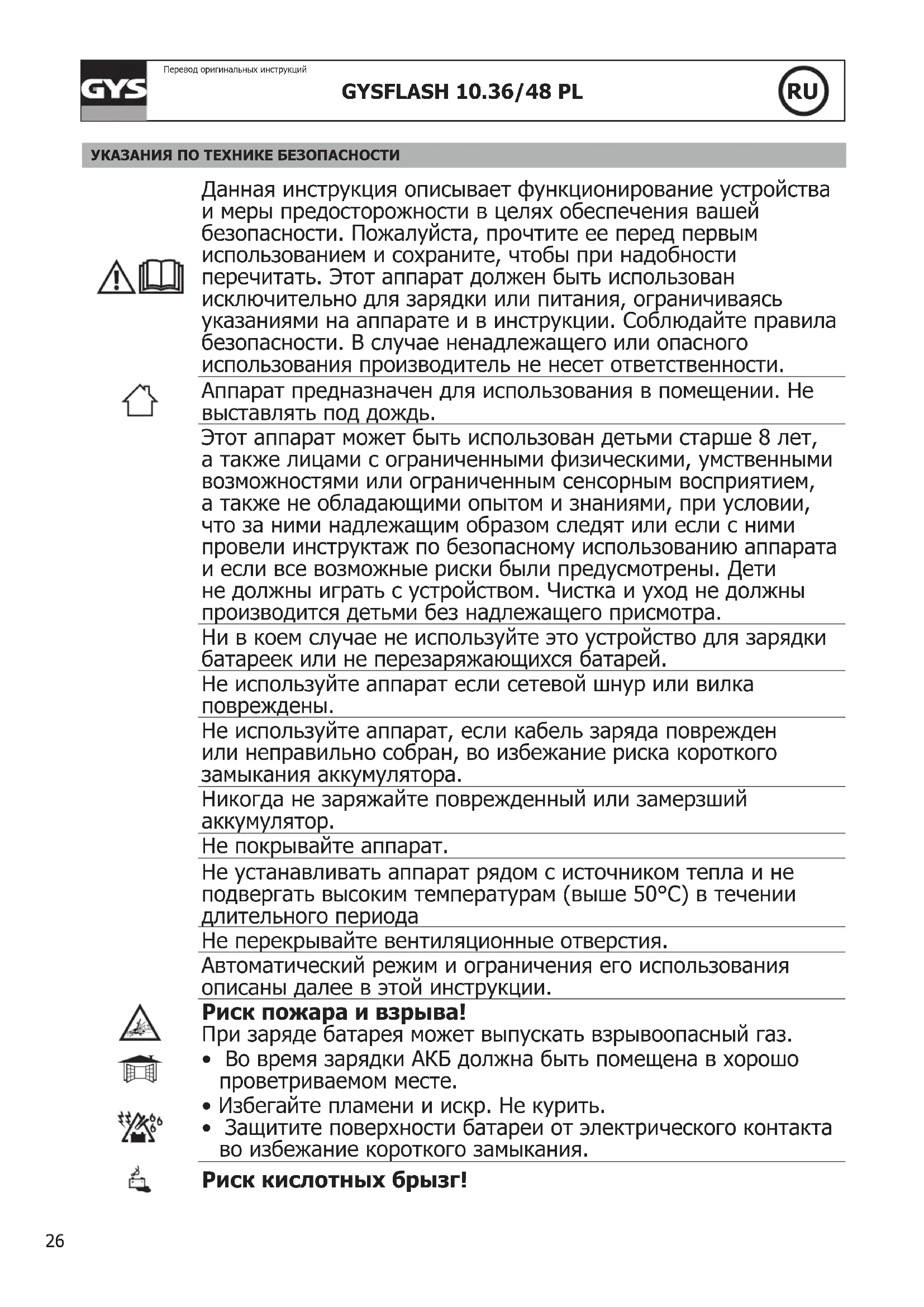 - Защитите поверхности батареи от электрического контакта во избежание короткого замыкания. Риск кислотных брызг!27 GYSFLASH 10.36/48 PL