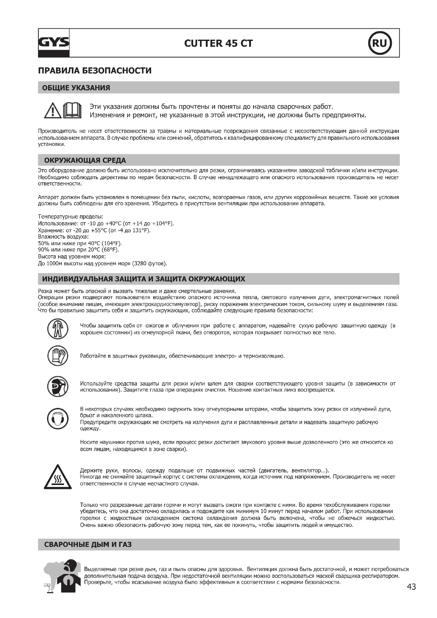 Носите наушники против шума, если процесс резки достигает звукового уровня выше дозволенного (это же относится ко всем лицам, находящимся в зоне сварки). Держите руки, волосы, одежду подальше от подвижных частей (двигатель, вентилятор…). Никогда не снимайте защитный корпус с системы охлаждения, когда источник под напряжением. Производитель не несет ответственности в случае несчастного случая. Только что разрезанные детали горячи и могут вызвать ожоги при контакте с ними. Во время техобслуживания горелки убедитесь, что она достаточно охладилась и подождите как минимум 10 минут перед началом работ. При использовании горелки с жидкостным охлаждением система охлаждения должна быть включена, чтобы не обжечься жидкостью. Очень важно обезопасить рабочую зону перед тем, как ее покинуть, чтобы защитить людей и имущество. СВАРОЧНЫЕ ДЫМ И ГАЗ Выделяемые при резке дым, газ и пыль опасны для здоровья. Вентиляция должна быть достаточной, и может потребоваться дополнительная подача воздуха. При недостаточной вентиляции можно воспользоваться маской сварщика-респиратором. Проверьте, чтобы всасывание воздуха было эффективным в соответствии с нормами безопасности.44 CUTTER 45 CT