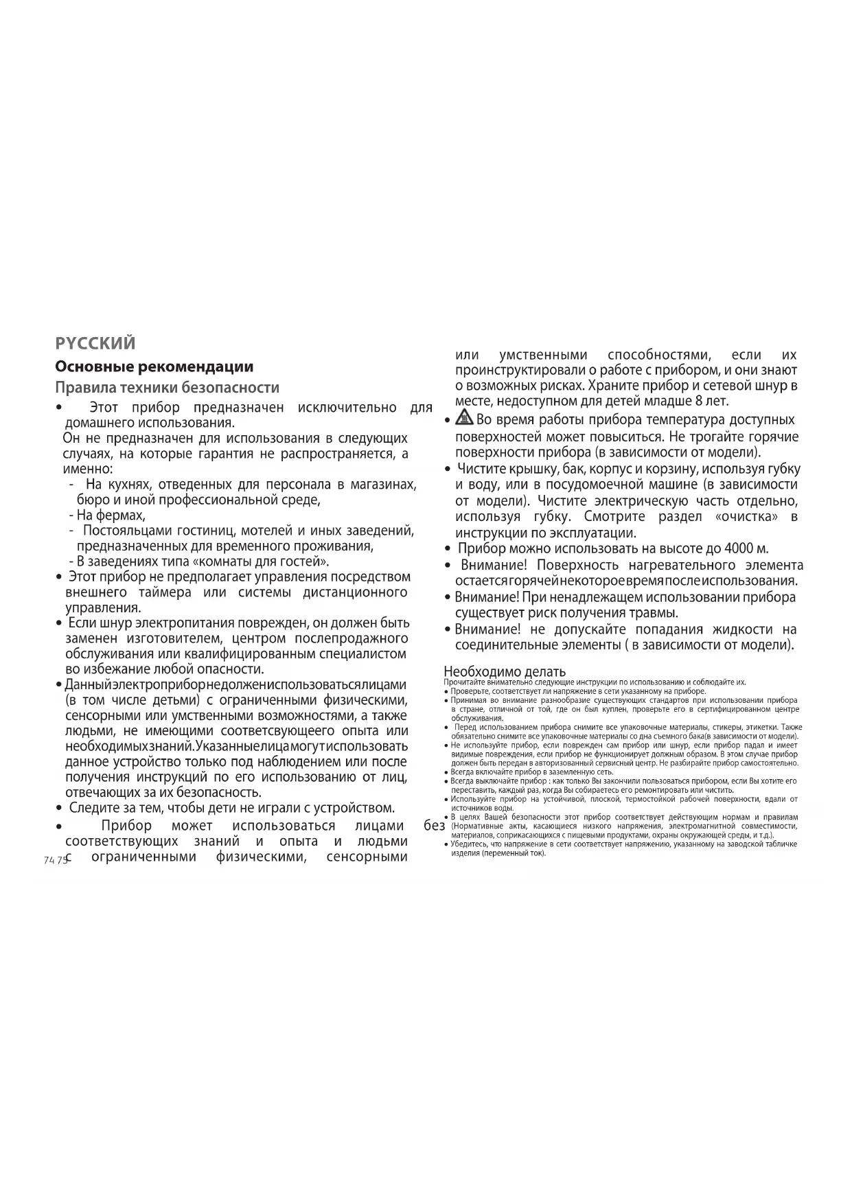 Прибор может использоваться лицами без соответствующих знаний и опыта и людьми с ограниченными физическими, сенсорными PYCCKИЙ или умственными способностями, если их проинструктировали о работе с прибором, и они знают о возможных рисках. Храните прибор и сетевой шнур в месте, недоступном для детей младше 8 лет.