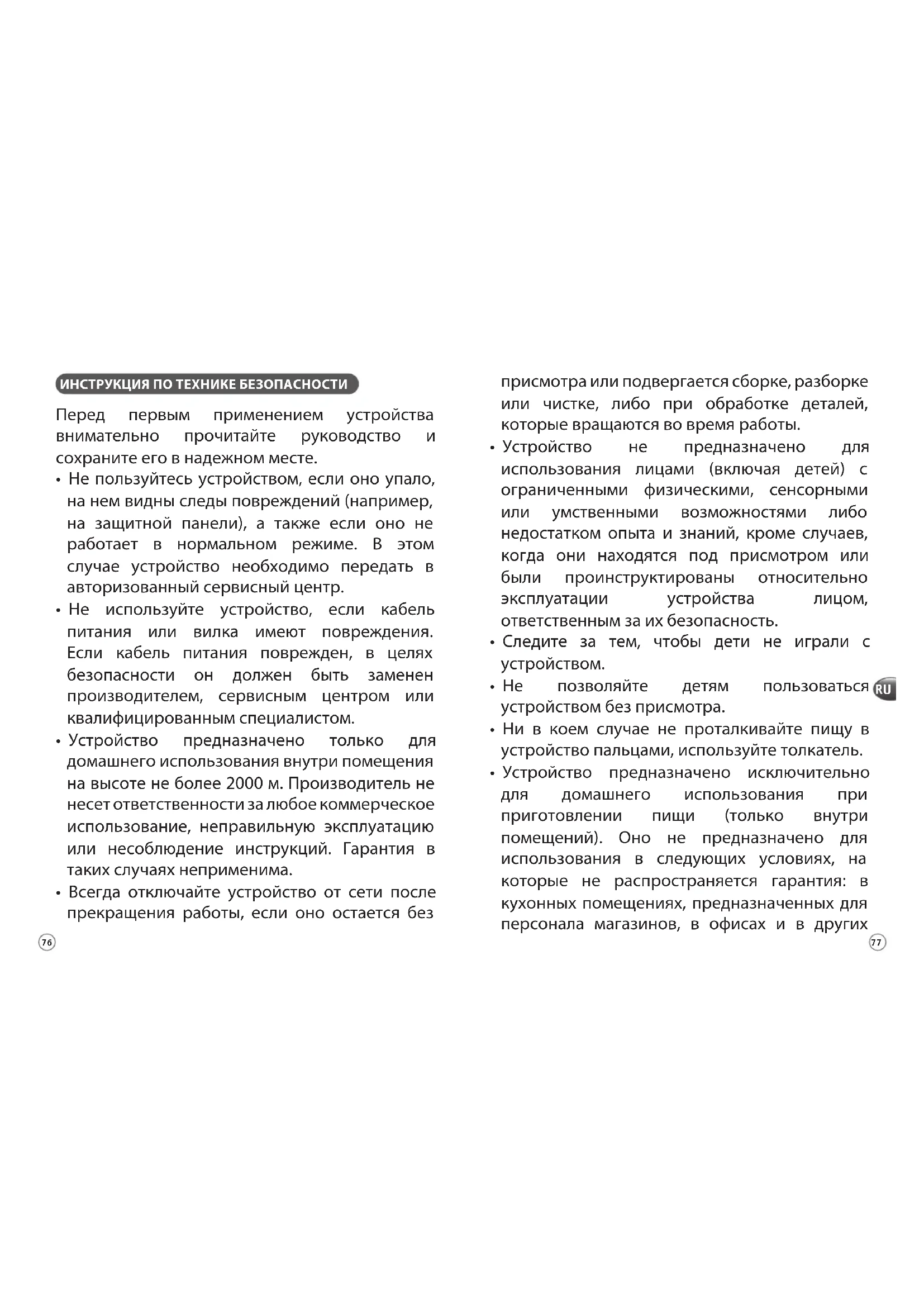 - Устройство предназначено исключительно для домашнего использования при приготовлении пищи (только внутри помещений). Оно не предназначено для использования в следующих условиях, на которые не распространяется гарантия: в кухонных помещениях, предназначенных для персонала магазинов, в офисах и в других ИНСТРУКЦИЯ ПО ТЕХНИКЕ БЕЗОПАСНОСТИ Перед первым применением устройства внимательно прочитайте руководство и сохраните его в надежном месте.