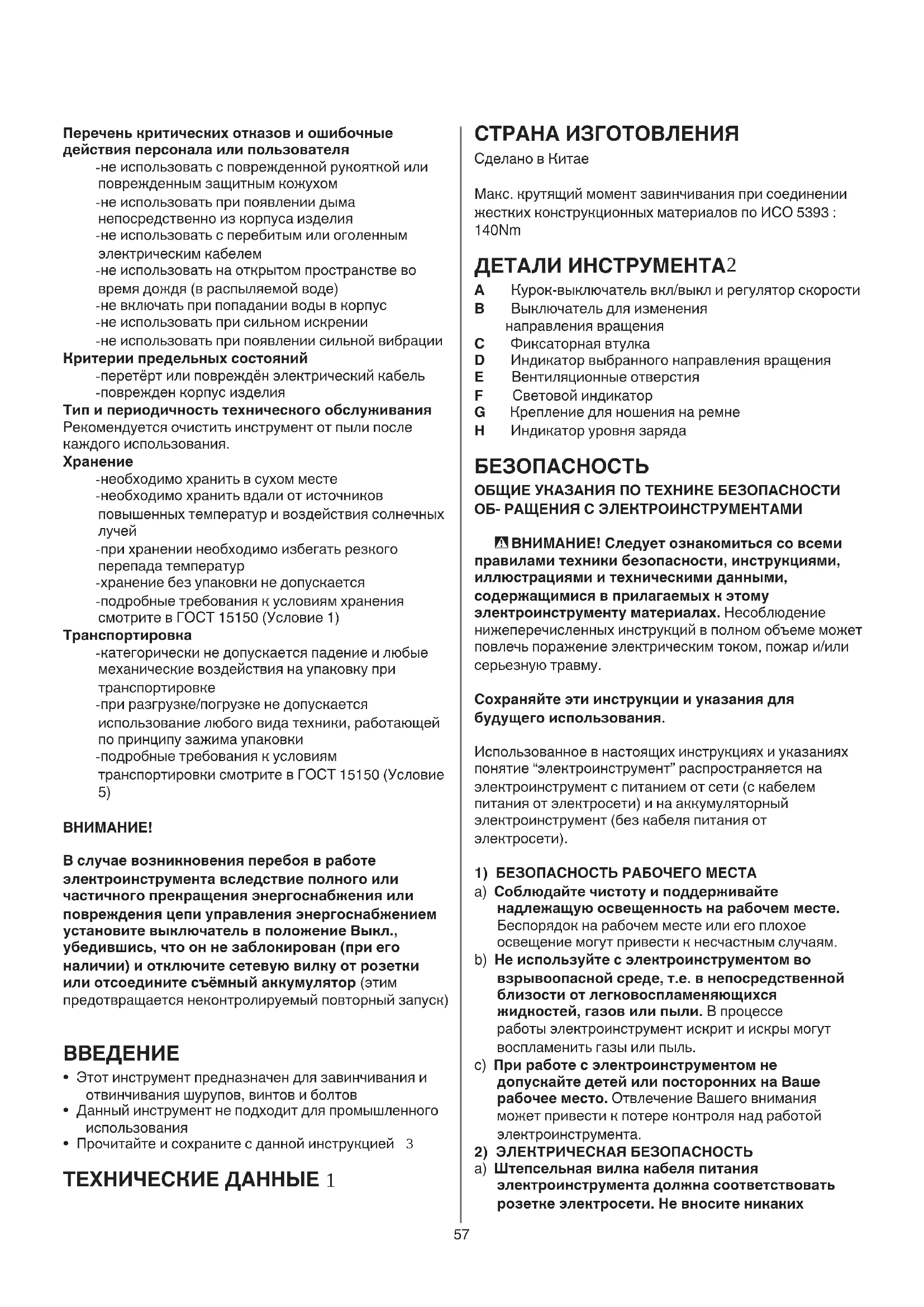 a) Будьте внимательны, следите за тем, что Вы делаете и выполняйте работу обдуманно. Не пользуйтесь электроинструментом, если Вы устали или находитесь под воздействием транквилизаторов, алкоголя или медицинских препаратов. Секундная потеря концентрации в работе с электроинструментом может привести к серьезным травмам. b) Используйте средства индивидуальной защиты. Защитные очки обязательны. Средства индивидуальной защиты, такие как противопылевой респиратор, нескользящая защитная обувь, шлем-каска, средства защиты органов слуха применяются в соответствующих условиям работы обстоятельствах и минимизируют возможность получения травм. c) Предотвращайте непреднамеренное включение электроинструмента. Перед подключением электроинструмента к электропитанию и/или к аккумулятору убедитесь в выключенном состоянии электроинструмента. Если Вы при транспортировке электроинструмента держите палец на выключателе или включенный электроинструмент подключаете к сети питания, то это может привести к несчастному случаю. d) Во избежание травм перед включением электроинструмента удалите регулировочный или гаечный ключ из вращающейся части59 обслуживание только квалифицированному персоналу, использующему только подлинные запасные части. Это обеспечит сохранение безопасности электроинструмента. b) Никогда не обслуживайте поврежденные аккумуляторы. Обслуживать аккумуляторы разрешается только производителю или авторизованной сервисной организации. ПРАВИЛА ТЕХНИКИ БЕЗОПАСНОСТИ ПРИ РАБОТЕ С АККУМУЛЯТОРНЫМ УДАРНЫМ ШУРУПОВЕРТОМ