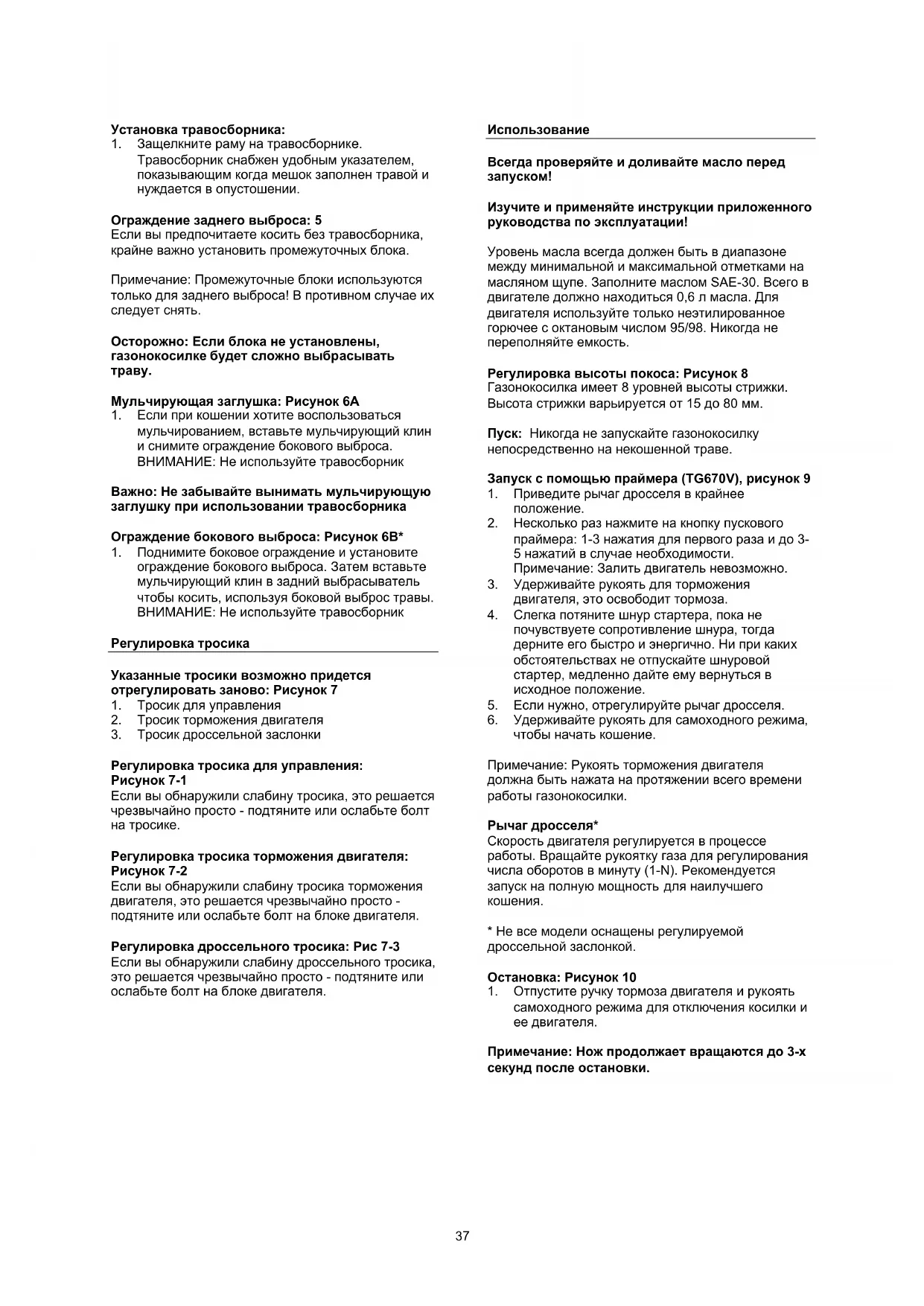 ограждение бокового выброса. Затем вставьте мульчирующий клин в задний выбрасыватель чтобы косить, используя боковой выброс травы. ВНИМАНИЕ: Не используйте травосборник Регулировка тросика Указанные тросики возможно придется отрегулировать заново: Рисунок 7