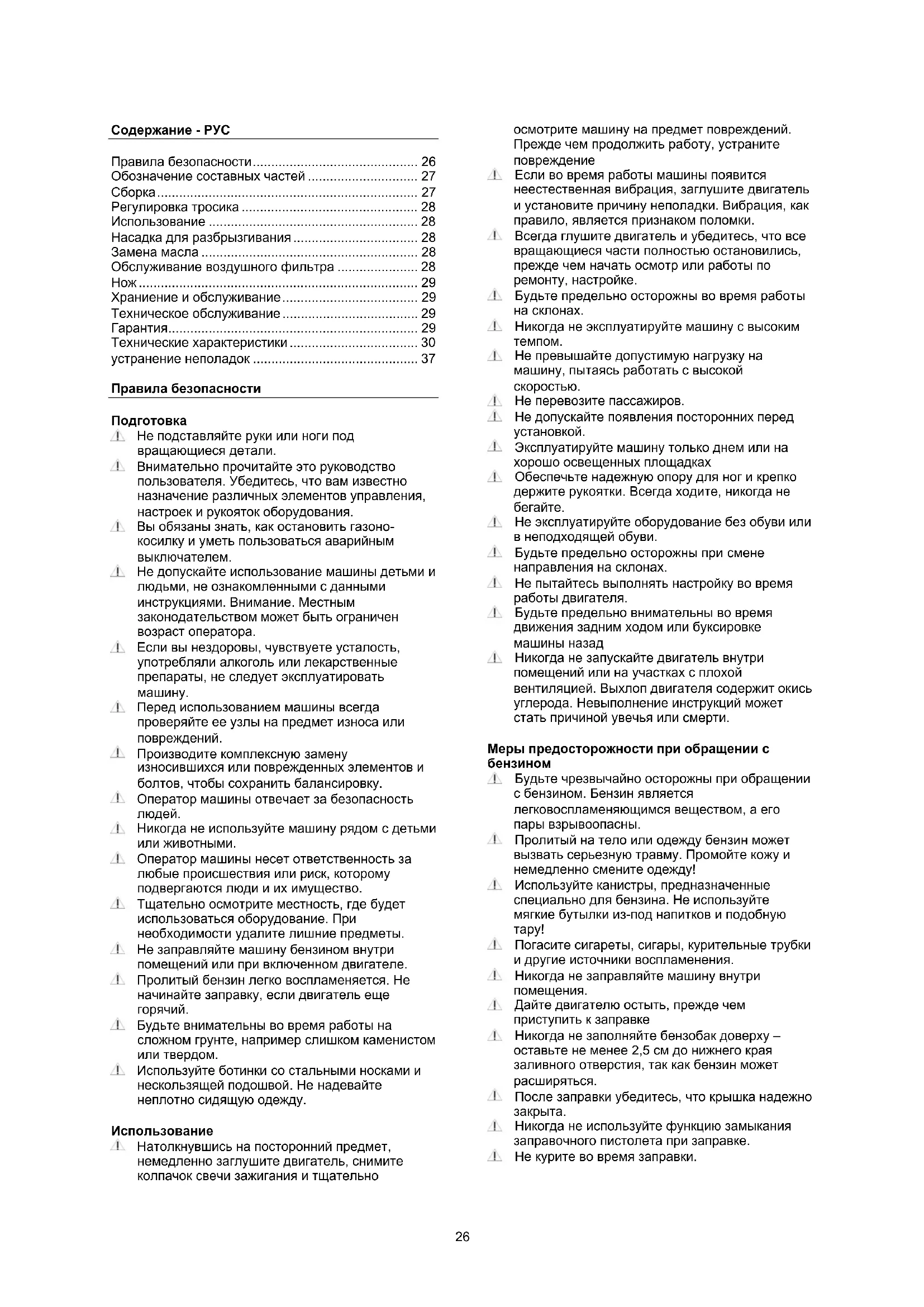 - Гарантия не распространяется на чистку топливной системы, замену или регулировку шнура стартера, пружины стартера, свечу зажигания, нож, держатель ножа, ремень и