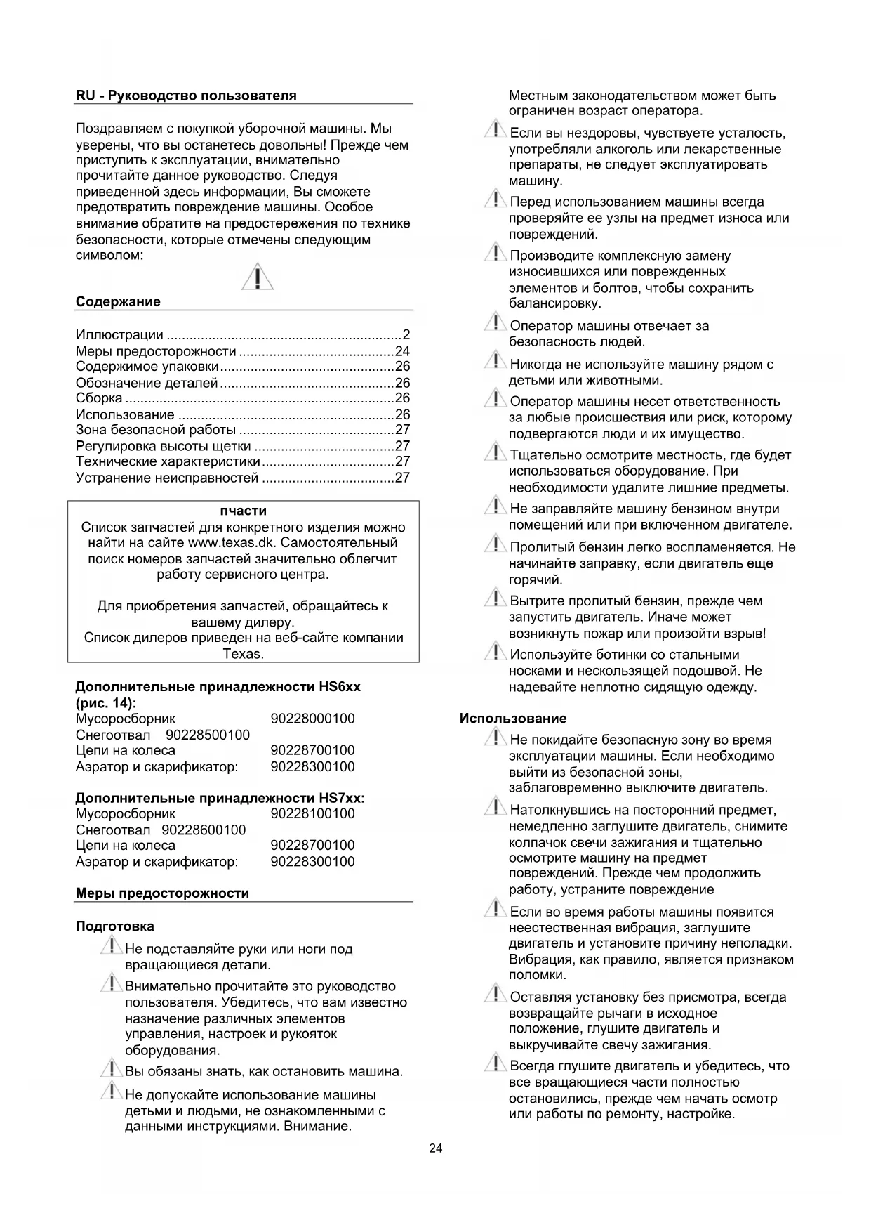 Список запчастей для конкретного изделия можно найти на сайте www.texas.dk. Самостоятельный поиск номеров запчастей значительно облегчит работу сервисного центра. Для приобретения запчастей, обращайтесь к вашему дилеру. Список дилеров приведен на веб-сайте компании Texas. Дополнительные принадлежности HS6xx (рис. 14): Мусоросборник 90228000100 Снегоотвал 90228500100 Цепи на колеса 90228700100 Aэратор и скарификатор: 90228300100 Дополнительные принадлежности HS7xx: Мусоросборник 90228100100 Снегоотвал 90228600100 Цепи на колеса 90228700100 Aэратор и скарификатор: 90228300100 Меры предосторожности