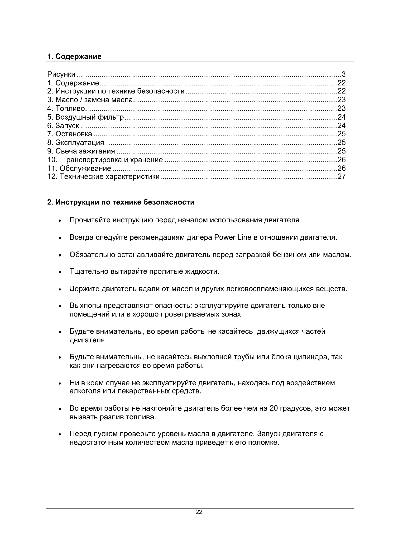 - Всегда следуйте рекомендациям дилера Power Line в отношении двигателя.