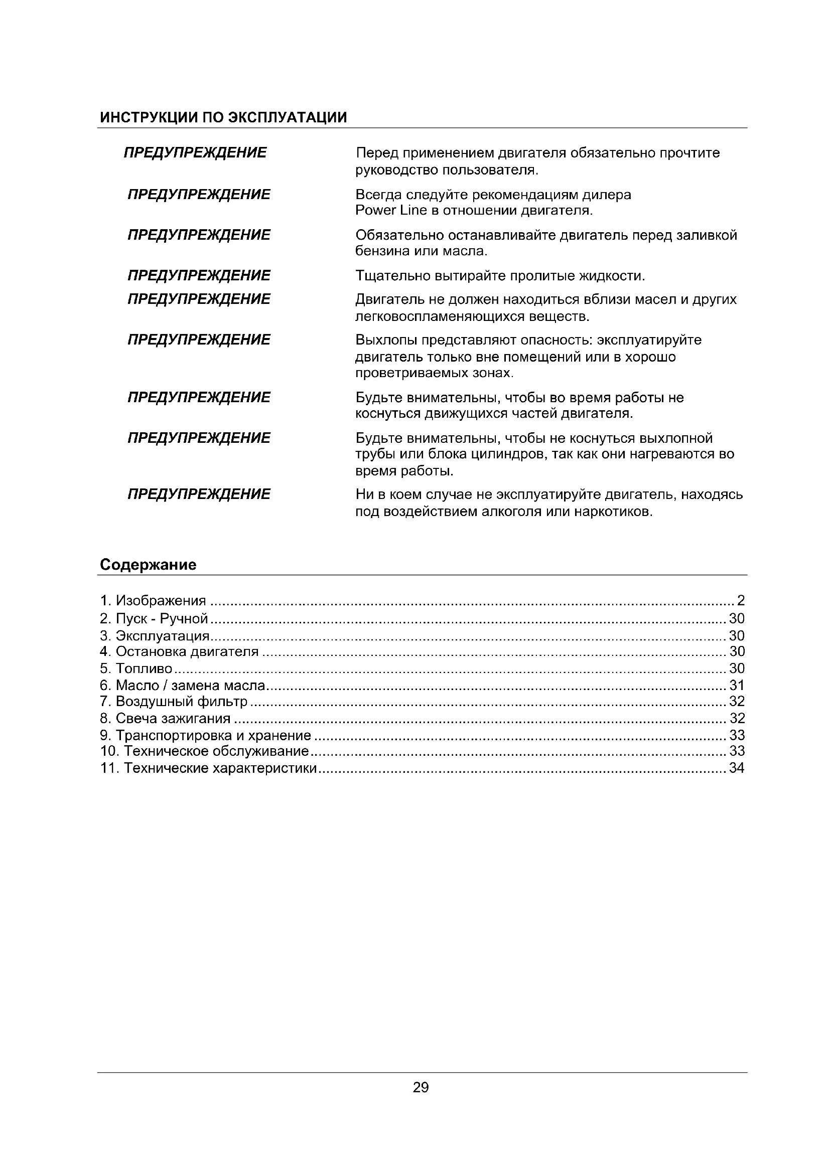 rt no 40-11294 Système de régulation Mécanique Mécanique Sens de rotation de la prise de force 380 x 315 x 335 380 x 315 x 335 Dimensions (LxBxH) 16 1629 ИНСТРУКЦИИ ПО ЭКСПЛУАТАЦИИ ПРЕДУПРЕЖДЕНИЕ Перед применением двигателя обязательно прочтите руководство пользователя. ПРЕДУПРЕЖДЕНИЕ Всегда следуйте рекомендациям дилера Power Line в отношении двигателя. ПРЕДУПРЕЖДЕНИЕ Обязательно останавливайте двигатель перед заливкой бензина или масла. ПРЕДУПРЕЖДЕНИЕ Тщательно вытирайте пролитые жидкости. ПРЕДУПРЕЖДЕНИЕ Двигатель не должен находиться вблизи масел и других легковоспламеняющихся веществ. ПРЕДУПРЕЖДЕНИЕ Выхлопы представляют опасность: эксплуатируйте двигатель только вне помещений или в хорошо проветриваемых зонах. ПРЕДУПРЕЖДЕНИЕ Будьте внимательны, чтобы во время работы не коснуться движущихся частей двигателя. ПРЕДУПРЕЖДЕНИЕ Будьте внимательны, чтобы не коснуться выхлопной трубы или блока цилиндров, так как они нагреваются во время работы. ПРЕДУПРЕЖДЕНИЕ Ни в коем случае не эксплуатируйте двигатель, находясь под воздействием алкоголя или наркотиков.