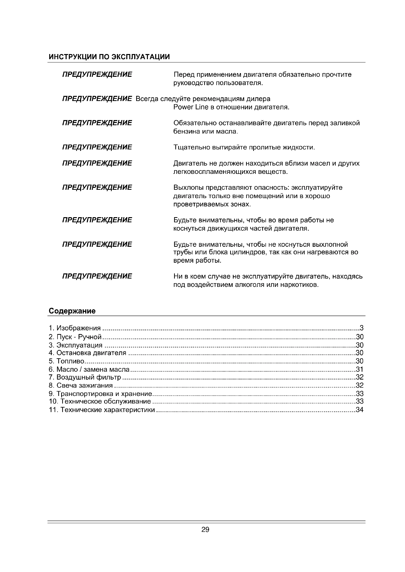 ИНСТРУКЦИИ ПО ЭКСПЛУАТАЦИИ ПРЕДУПРЕЖДЕНИЕ Перед применением двигателя обязательно прочтите руководство пользователя. ПРЕДУПРЕЖДЕНИЕ Всегда следуйте рекомендациям дилера Power Line в отношении двигателя. ПРЕДУПРЕЖДЕНИЕ Обязательно останавливайте двигатель перед заливкой бензина или масла. ПРЕДУПРЕЖДЕНИЕ Тщательно вытирайте пролитые жидкости. ПРЕДУПРЕЖДЕНИЕ Двигатель не должен находиться вблизи масел и других легковоспламеняющихся веществ. ПРЕДУПРЕЖДЕНИЕ Выхлопы представляют опасность: эксплуатируйте двигатель только вне помещений или в хорошо проветриваемых зонах. ПРЕДУПРЕЖДЕНИЕ Будьте внимательны, чтобы во время работы не коснуться движущихся частей двигателя. ПРЕДУПРЕЖДЕНИЕ Будьте внимательны, чтобы не коснуться выхлопной трубы или блока цилиндров, так как они нагреваются во время работы. ПРЕДУПРЕЖДЕНИЕ Ни в коем случае не эксплуатируйте двигатель, находясь под воздействием алкоголя или наркотиков.