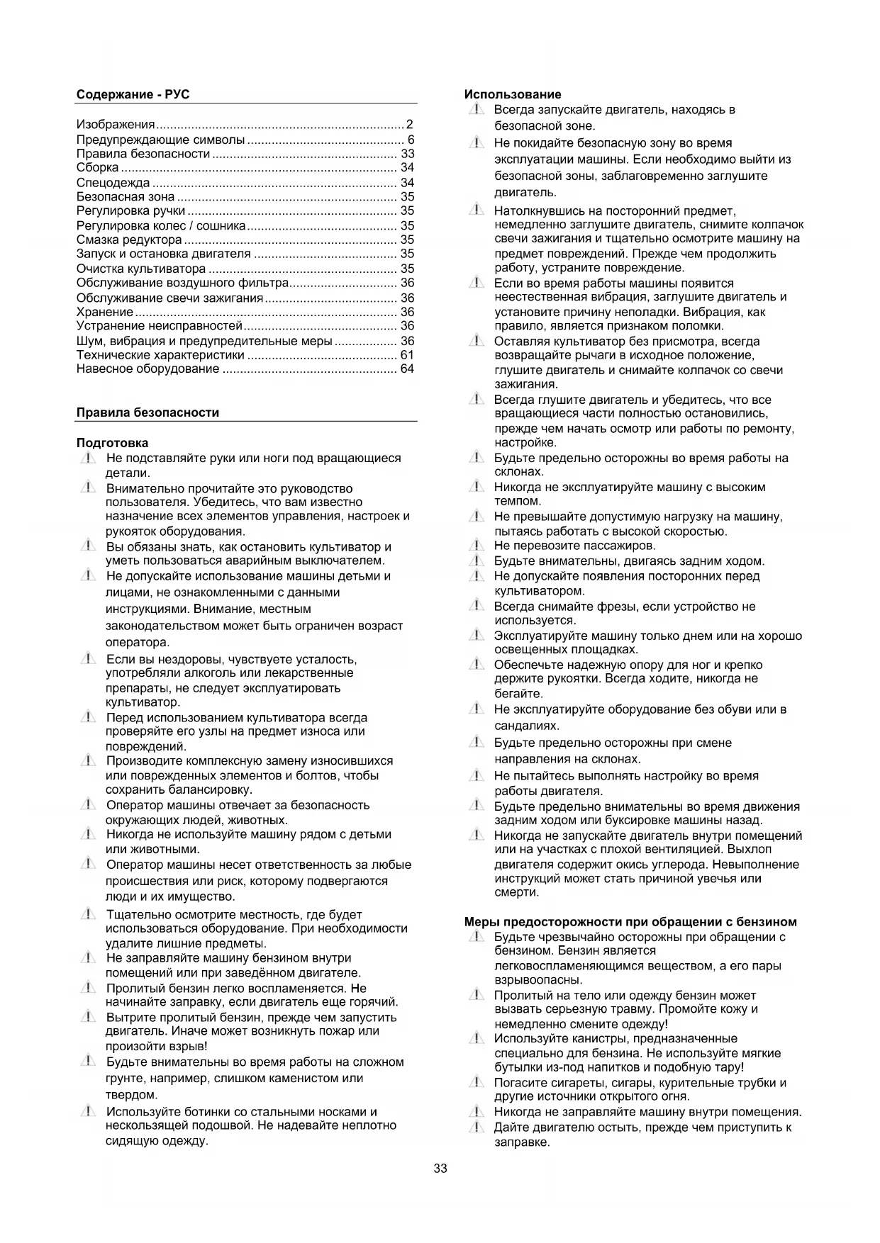 Если вы нездоровы, чувствуете усталость, употребляли алкоголь или лекарственные препараты, не следует эксплуатировать культиватор. Перед использованием культиватора всегда проверяйте его узлы на предмет износа или повреждений. Производите комплексную замену износившихся или поврежденных элементов и болтов, чтобы сохранить балансировку. Оператор машины отвечает за безопасность окружающих людей, животных. Никогда не используйте машину рядом с детьми или животными. Оператор машины несет ответственность за любые происшествия или риск, которому подвергаются люди и их имущество. Тщательно осмотрите местность, где будет использоваться оборудование. При необходимости удалите лишние предметы. Не заправляйте машину бензином внутри помещений или при заведённом двигателе. Пролитый бензин легко воспламеняется. Не начинайте заправку, если двигатель еще горячий. Вытрите пролитый бензин, прежде чем запустить двигатель. Иначе может возникнуть пожар или произойти взрыв! Будьте внимательны во время работы на сложном грунте, например, слишком каменистом или