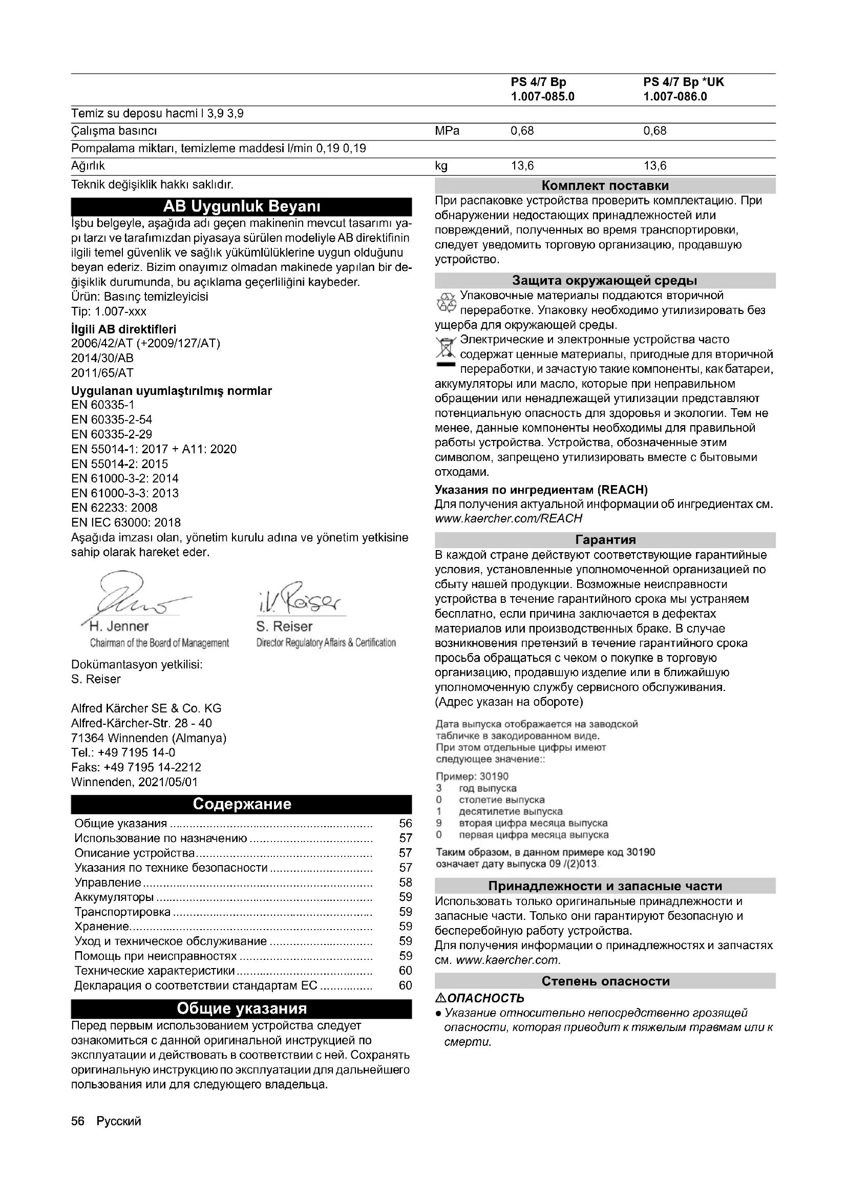 - Temiz su deposu hacmi l 3,9 3,9 Çalışma basıncı MPa 0,68 0,68 Pompalama miktarı, temizleme maddesi l/min 0,19 0,19 Ağırlık kg 13,6 13,6 PS 4/7 Bp 1.007-085.0 PS 4/7 Bp *UK 1.007-086.0 Общие указания p. 56
