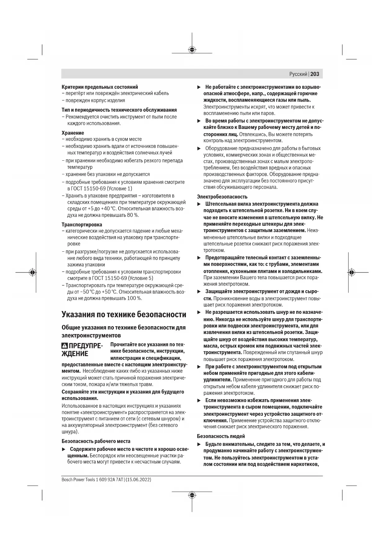 – не включать при попадании воды в корпус 1 609 92A 7AT | (15.06.2022) Bosch Power ToolsРусский | 203 Критерии предельных состояний – перетёрт или повреждён электрический кабель – поврежден корпус изделия Тип и периодичность технического обслуживания – Рекомендуется очистить инструмент от пыли после каждого использования.