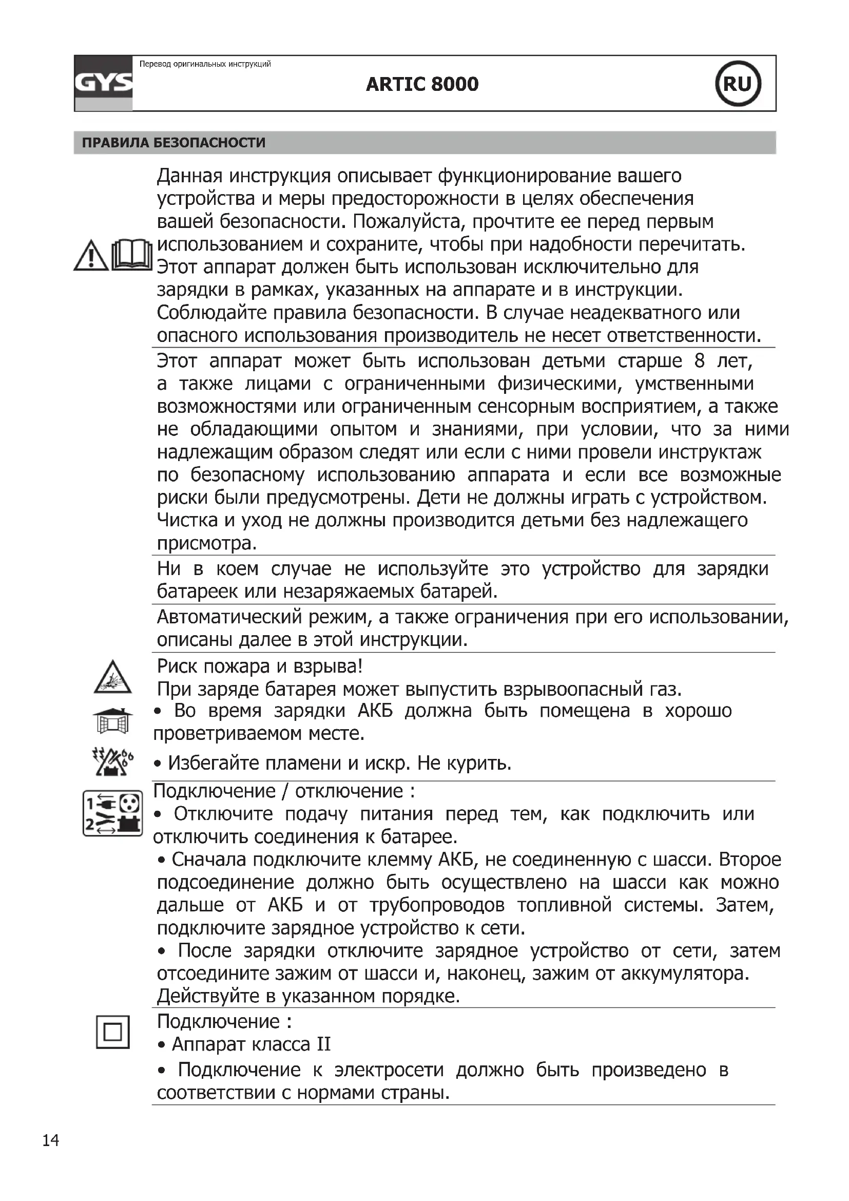 Скачайте инструкцию для вашего Зарядное устройство для батареек в формате PDF бесплатно! Найдите своё руководство Artic 8000 - GYS и возьмите своё электронное устройство обратно в руки. На этой странице опубликованы все документы, необходимые для использования вашего устройства. Artic 8000 бренда GYS.
