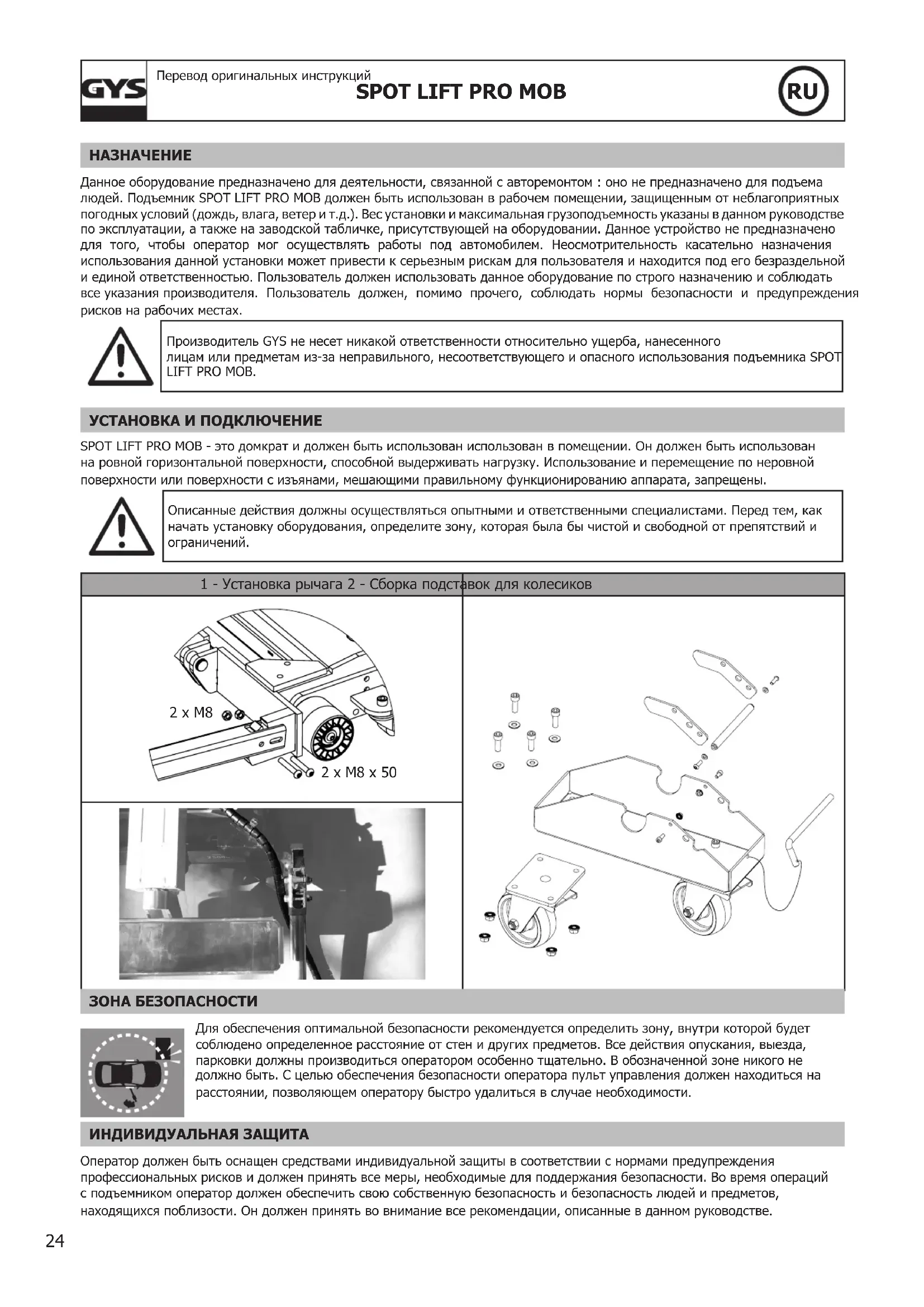 Перевод оригинальных инструкций Данное оборудование предназначено для деятельности, связанной с авторемонтом : оно не предназначено для подъема людей. Подъемник SPOT LIFT PRO MOB должен быть использован в рабочем помещении, защищенным от неблагоприятных погодных условий (дождь, влага, ветер и т.д.). Вес установки и максимальная грузоподъемность указаны в данном руководстве по эксплуатации, а также на заводской табличке, присутствующей на оборудовании. Данное устройство не предназначено для того, чтобы оператор мог осуществлять работы под автомобилем. Неосмотрительность касательно назначения использования данной установки может привести к серьезным рискам для пользователя и находится под его безраздельной и единой ответственностью. Пользователь должен использовать данное оборудование по строго назначению и соблюдать все указания производителя. Пользователь должен, помимо прочего, соблюдать нормы безопасности и предупреждения рисков на рабочих местах.Производитель GYS не несет никакой ответственности относительно ущерба, нанесенного лицам или предметам из-за неправильного, несоответствующего и опасного использования подъемника SPOT LIFT PRO MOB. УСТАНОВКА И ПОДКЛЮЧЕНИЕ SPOT LIFT PRO MOB - это домкрат и должен быть использован использован в помещении. Он должен быть использован на ровной горизонтальной поверхности, способной выдерживать нагрузку. Использование и перемещение по неровной поверхности или поверхности с изъянами, мешающими правильному функционированию аппарата, запрещены.Описанные действия должны осуществляться опытными и ответственными специалистами. Перед тем, как начать установку оборудования, определите зону, которая была бы чистой и свободной от препятствий и ограничений.
