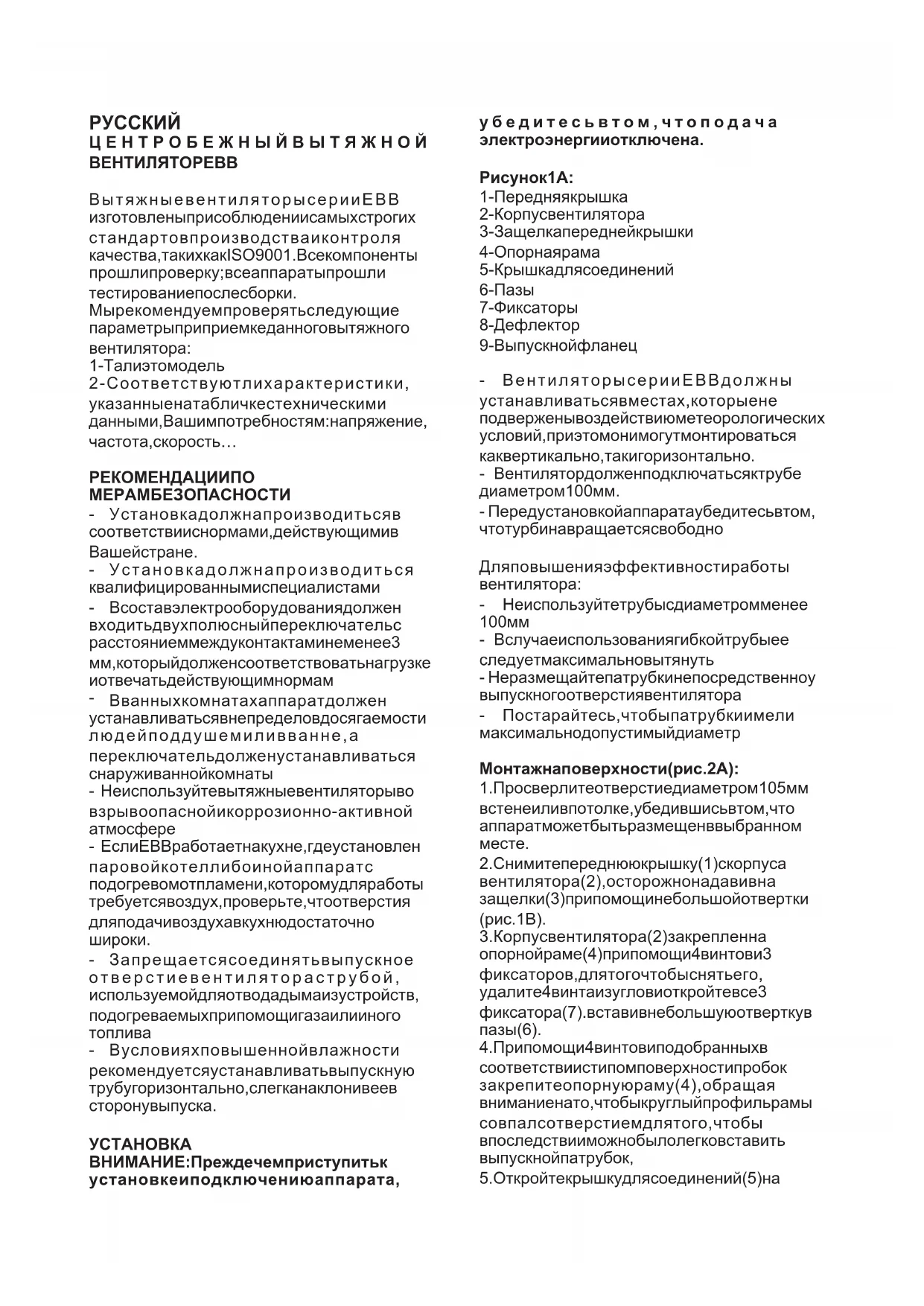 ВНИМАНИЕ: Прежде чем приступить к установке и подключению аппарата, убедитесь в том, что подача электроэнергии отключена. Рисунок 1А: Монтаж на поверхности(рис. 2А): Вытяжные вентиляторы серии ЕВВ изготовлены при соблюдении самых строгих стандартов производства и контроля качества, таких как ISO 9001. Все компоненты прошли проверку; все аппараты прошли тестирование после сборки. Мы рекомендуем проверять следующие параметры при приемке данного вытяжного вентилятора: