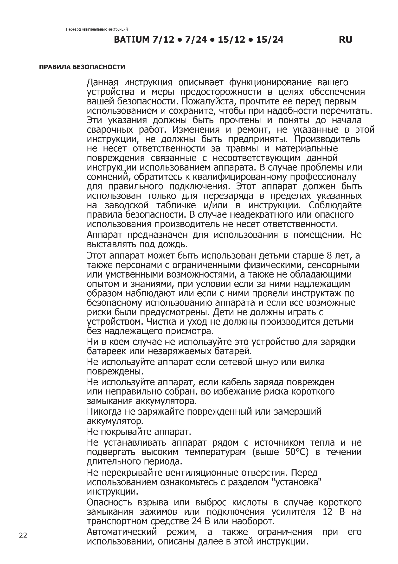 Перевод оригинальных инструкций ПРАВИЛА БЕЗОПАСНОСТИ Данная инструкция описывает функционирование вашего устройства и меры предосторожности в целях обеспечения вашей безопасности. Пожалуйста, прочтите ее перед первым использованием и сохраните, чтобы при надобности перечитать. Эти указания должны быть прочтены и поняты до начала сварочных работ. Изменения и ремонт, не указанные в этой инструкции, не должны быть предприняты. Производитель не несет ответственности за травмы и материальные повреждения связанные с несоответствующим данной инструкции использованием аппарата. В случае проблемы или сомнений, обратитесь к квалифицированному профессионалу для правильного подключения. Этот аппарат должен быть использован только для перезаряда в пределах указанных на заводской табличке и/или в инструкции. Соблюдайте правила безопасности. В случае неадекватного или опасного использования производитель не несет ответственности. Аппарат предназначен для использования в помещении. Не выставлять под дождь. Этот аппарат может быть использован детьми старше 8 лет, а также персонами с ограниченными физическими, сенсорными или умственными возможностями, а также не обладающими опытом и знаниями, при условии если за ними надлежащим образом наблюдают или если с ними провели инструктаж по безопасному использованию аппарата и если все возможные риски были предусмотрены. Дети не должны играть с устройством. Чистка и уход не должны производится детьми без надлежащего присмотра. Ни в коем случае не используйте это устройство для зарядки батареек или незаряжаемых батарей. Не используйте аппарат если сетевой шнур или вилка повреждены. Не используйте аппарат, если кабель заряда поврежден или неправильно собран, во избежание риска короткого замыкания аккумулятора. Никогда не заряжайте поврежденный или замерзший аккумулятор. Не покрывайте аппарат. Не устанавливать аппарат рядом с источником тепла и не подвергать высоким температурам (выше 50°C) в течении длительного периода. Не перекрывайте вентиляционные отверстия. Перед использованием ознакомьтесь с разделом "установка" инструкции. Опасность взрыва или выброс кислоты в случае короткого замыкания зажимов или подключения усилителя 12 В на транспортном средстве 24 В или наоборот. Автоматический режим, а также ограничения при его использовании, описаны далее в этой инструкции.BATIUM 7/12 • 7/24 • 15/12 • 15/24