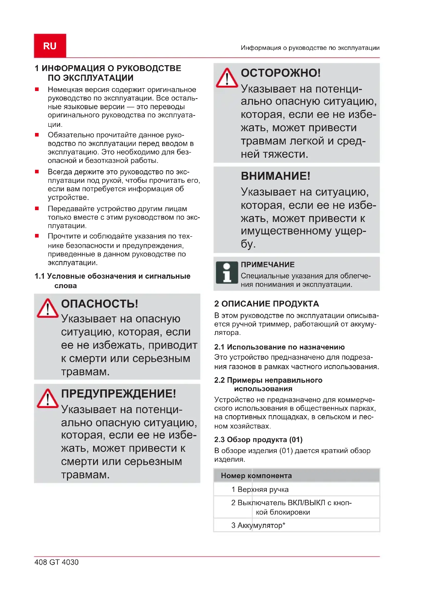 Специальные указания для облегче- ния понимания и эксплуатации. 2 ОПИСАНИЕ ПРОДУКТА В этом руководстве по эксплуатации описыва- ется ручной триммер, работающий от аккуму-