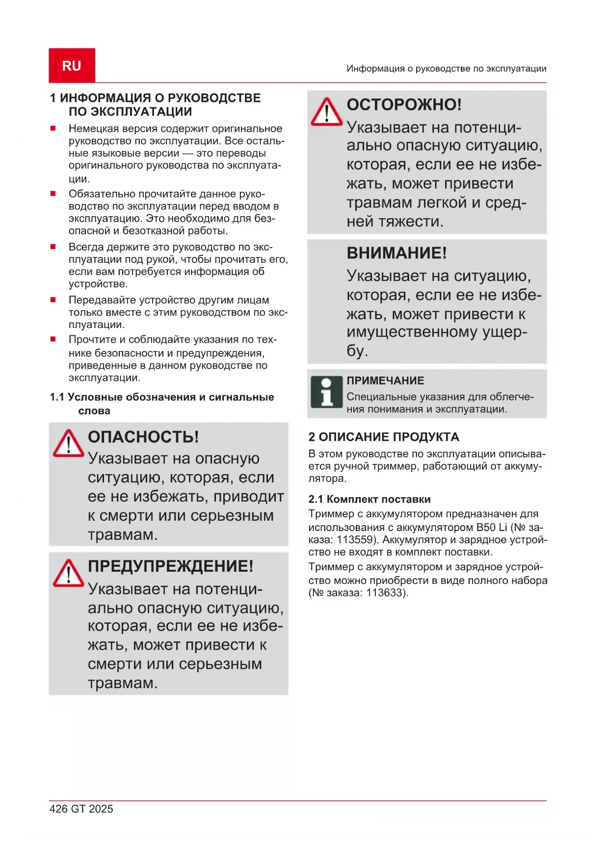 Специальные указания для облегче- ния понимания и эксплуатации. 2 ОПИСАНИЕ ПРОДУКТА В этом руководстве по эксплуатации описыва- ется ручной триммер, работающий от аккуму-