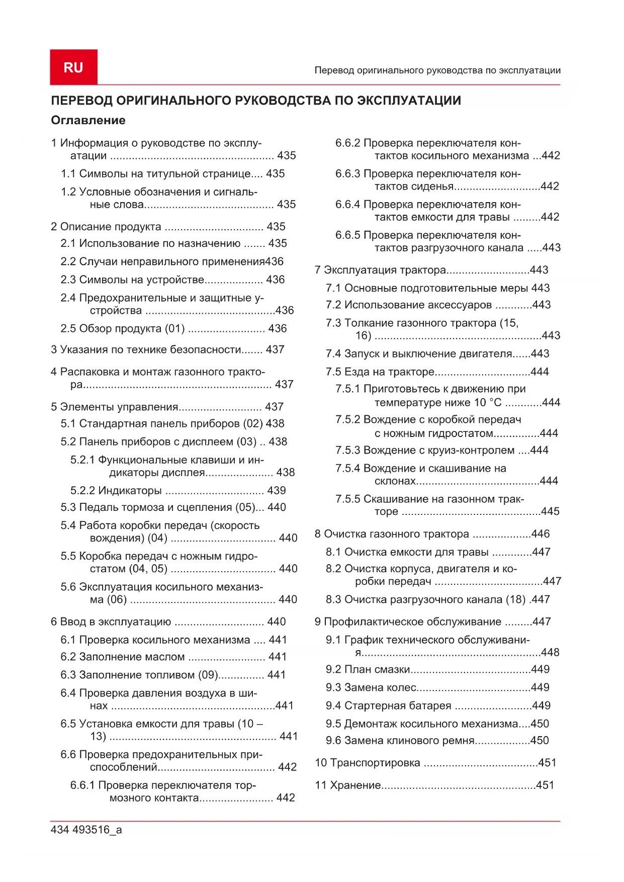 3 Указания по технике безопасности....... 437 4 Распаковка и монтаж газонного тракто- ра............................................................. 437 5 Элементы управления........................... 437