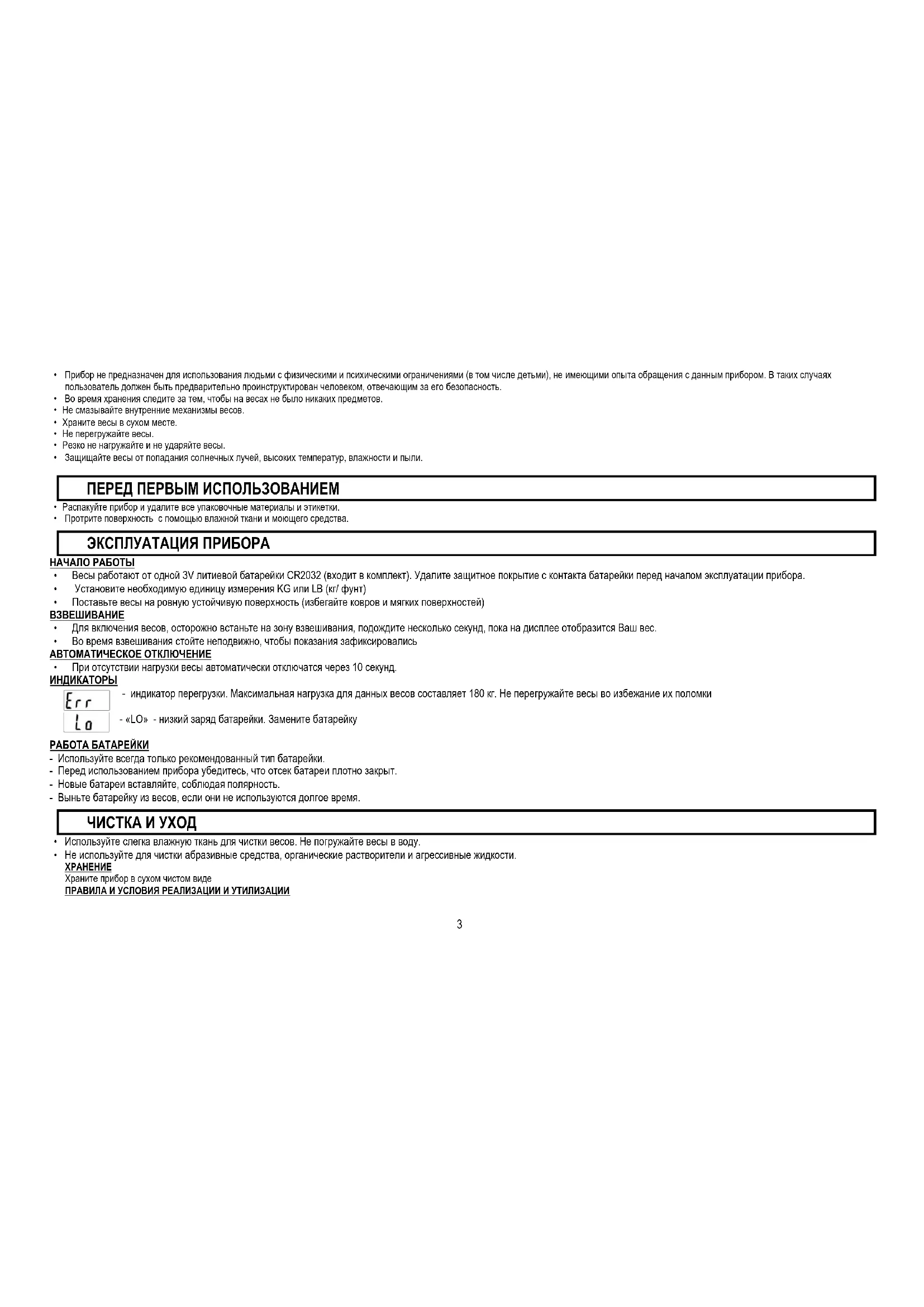 - индикатор перегрузки. Максимальная нагрузка для данных весов составляет 180 кг. Не перегружайте весы во избежание их поломки - «LO» - низкий заряд батарейки. Замените батарейку РАБОТА БАТАРЕЙКИ - Используйте всегда только рекомендованный тип батарейки. - Перед использованием прибора убедитесь, что отсек батареи плотно закрыт. - Новые батареи вставляйте, соблюдая полярность. - Выньте батарейку из весов, если они не используются долгое время. ЧИСТКА И УХОД