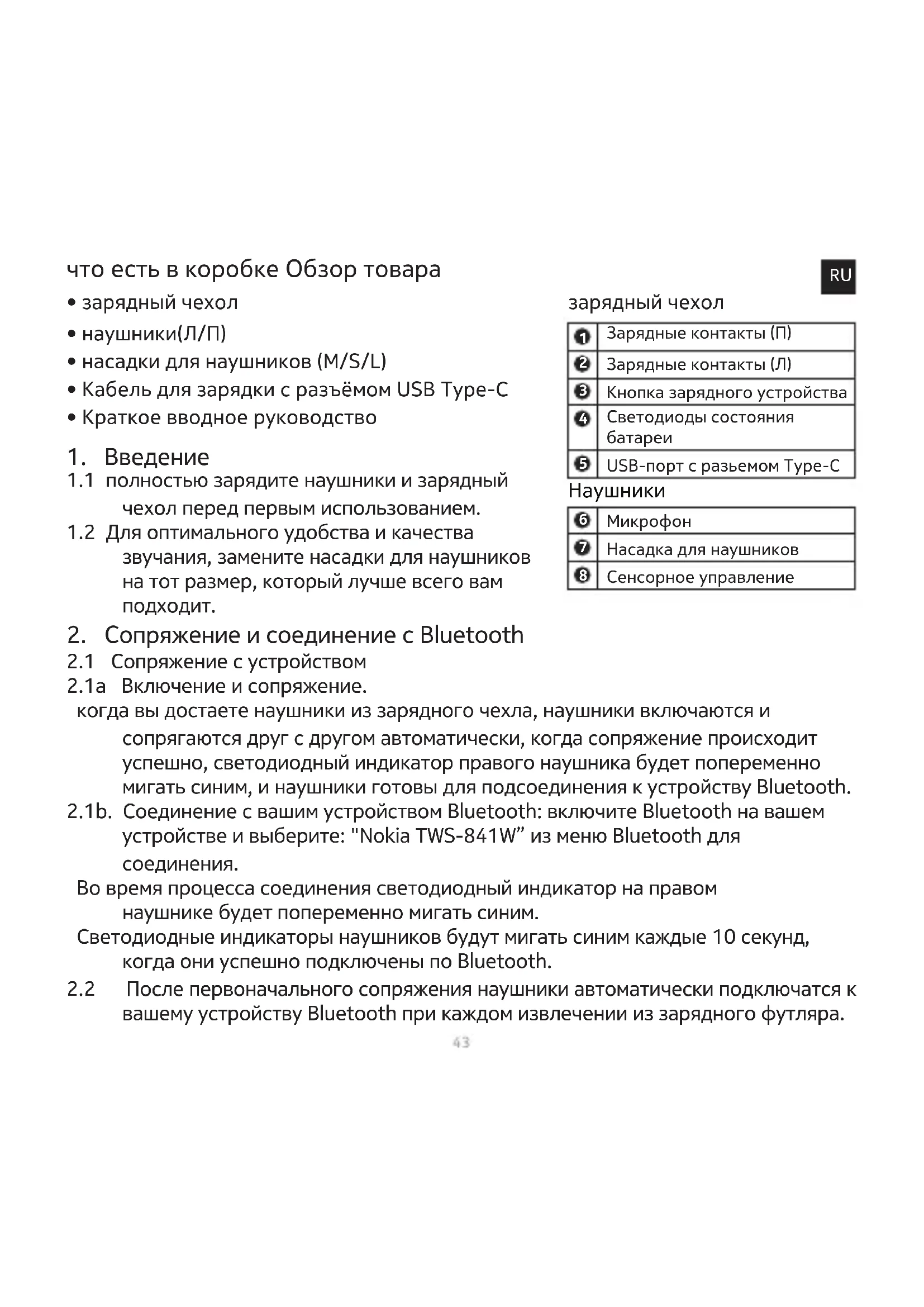 2.1a Включение и сопряжение. когда вы достаете наушники из зарядного чехла, наушники включаются и сопрягаются друг с другом автоматически, когда сопряжение происходит успешно, светодиодный индикатор правого наушника будет попеременно мигать синим, и наушники готовы для подсоединения к устройству Bluetooth. 2.1b. Соединение с вашим устройством Bluetooth: включите Bluetooth на вашем устройстве и выберите: "Nokia TWS-841W” из меню Bluetooth для соединения. Во время процесса соединения светодиодный индикатор на правом наушнике будет попеременно мигать синим. Светодиодные индикаторы наушников будут мигать синим каждые 10 секунд, когда они успешно подключены по Bluetooth.