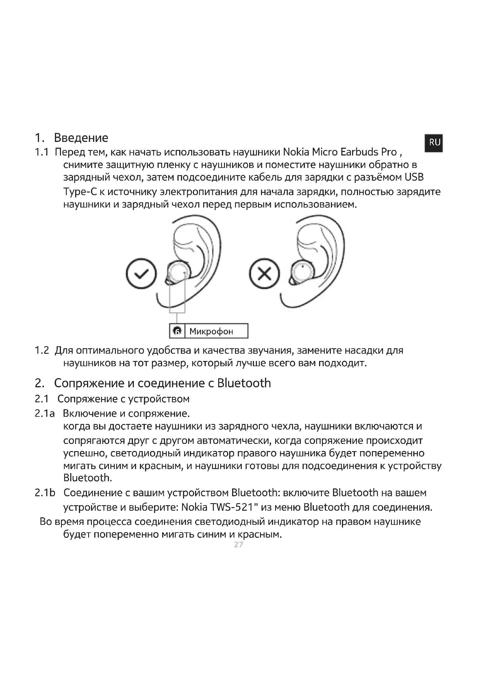 РУКОВОДСТВО ПОЛЬЗОВАТЕЛЯ Micro Earbuds Pro TWS521 NOKIA