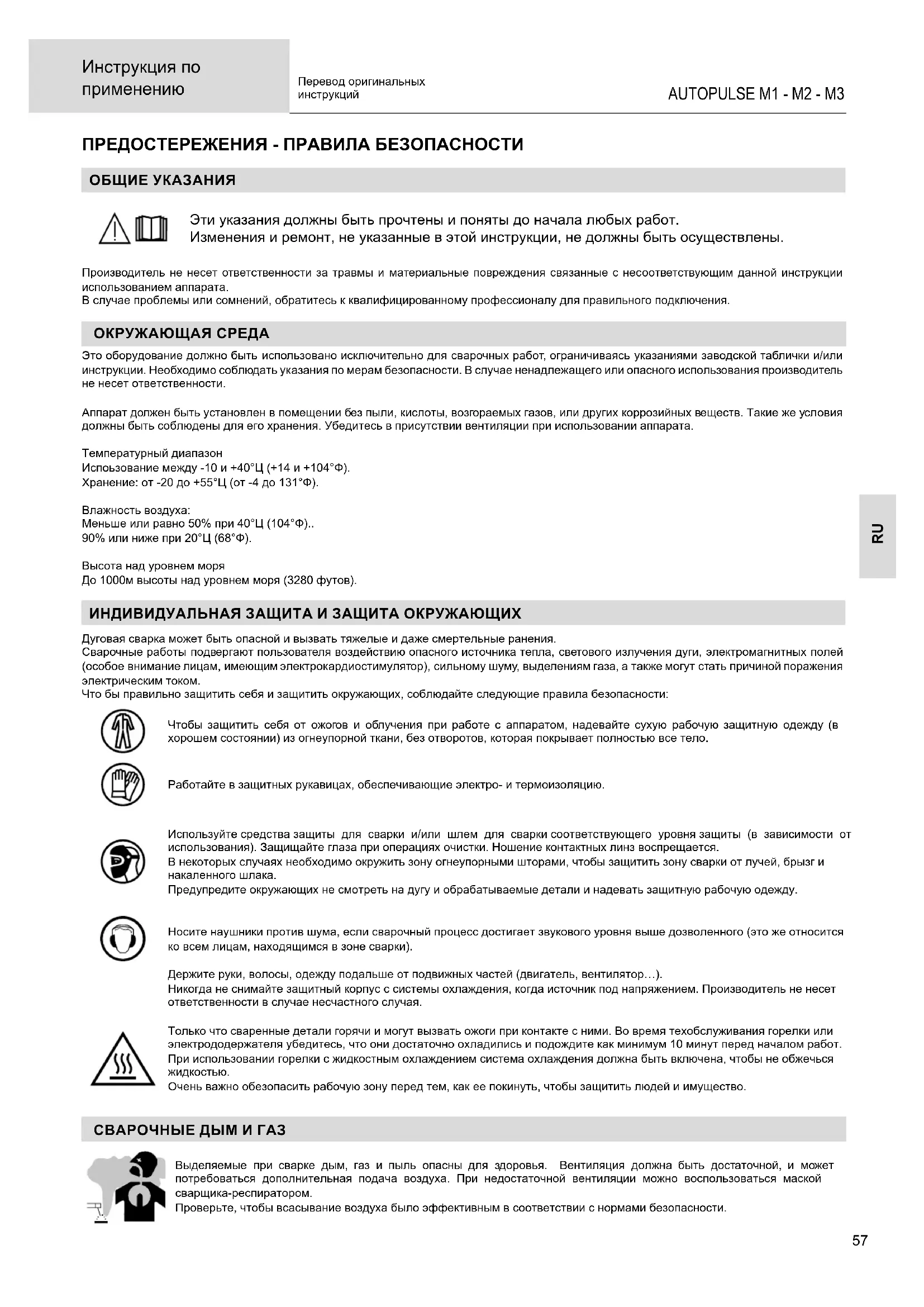 ПРЕДОСТЕРЕЖЕНИЯ - ПРАВИЛА БЕЗОПАСНОСТИ ОБЩИЕ УКАЗАНИЯ Эти указания должны быть прочтены и поняты до начала любых работ. Изменения и ремонт, не указанные в этой инструкции, не должны быть осуществлены. Производитель не несет ответственности за травмы и материальные повреждения связанные с несоответствующим данной инструкции использованием аппарата. В случае проблемы или сомнений, обратитесь к квалифицированному профессионалу для правильного подключения. ОКРУЖАЮЩАЯ СРЕДА Это оборудование должно быть использовано исключительно для сварочных работ, ограничиваясь указаниями заводской таблички и/или инструкции. Необходимо соблюдать указания по мерам безопасности. В случае ненадлежащего или опасного использования производитель не несет ответственности. Аппарат должен быть установлен в помещении без пыли, кислоты, возгораемых газов, или других коррозийных веществ. Такие же условия должны быть соблюдены для его хранения. Убедитесь в присутствии вентиляции при использовании аппарата. Температурный диапазон Испоьзование между -10 и +40°Ц (+14 и +104°Ф). Хранение: от -20 до +55°Ц (от -4 до 131°Ф). Влажность воздуха: Меньше или равно 50% при 40°Ц (104°Ф).. 90% или ниже при 20°Ц (68°Ф). Высота над уровнем моря До 1000м высоты над уровнем моря (3280 футов). ИНДИВИДУАЛЬНАЯ ЗАЩИТА И ЗАЩИТА ОКРУЖАЮЩИХ Дуговая сварка может быть опасной и вызвать тяжелые и даже смертельные ранения. Сварочные работы подвергают пользователя воздействию опасного источника тепла, светового излучения дуги, электромагнитных полей (особое внимание лицам, имеющим электрокардиостимулятор), сильному шуму, выделениям газа, а также могут стать причиной поражения электрическим током. Что бы правильно защитить себя и защитить окружающих, соблюдайте следующие правила безопасности: Чтобы защитить себя от ожогов и облучения при работе с аппаратом, надевайте сухую рабочую защитную одежду (в хорошем состоянии) из огнеупорной ткани, без отворотов, которая покрывает полностью все тело. Работайте в защитных рукавицах, обеспечивающие электро- и термоизоляцию. Используйте средства защиты для сварки и/или шлем для сварки соответствующего уровня защиты (в зависимости от использования). Защищайте глаза при операциях очистки. Ношение контактных линз воспрещается. В некоторых случаях необходимо окружить зону огнеупорными шторами, чтобы защитить зону сварки от лучей, брызг и накаленного шлака. Предупредите окружающих не смотреть на дугу и обрабатываемые детали и надевать защитную рабочую одежду. Носите наушники против шума, если сварочный процесс достигает звукового уровня выше дозволенного (это же относится ко всем лицам, находящимся в зоне сварки). Держите руки, волосы, одежду подальше от подвижных частей (двигатель, вентилятор…). Никогда не снимайте защитный корпус с системы охлаждения, когда источник под напряжением. Производитель не несет ответственности в случае несчастного случая. Только что сваренные детали горячи и могут вызвать ожоги при контакте с ними. Во время техобслуживания горелки или электрододержателя убедитесь, что они достаточно охладились и подождите как минимум 10 минут перед началом работ. При использовании горелки с жидкостным охлаждением система охлаждения должна быть включена, чтобы не обжечься