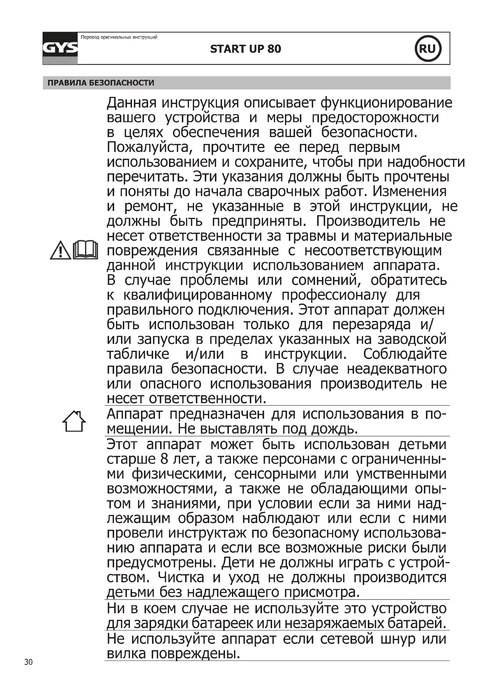Перевод оригинальных инструкций ПРАВИЛА БЕЗОПАСНОСТИ Данная инструкция описывает функционирование вашего устройства и меры предосторожности в целях обеспечения вашей безопасности. Пожалуйста, прочтите ее перед первым использованием и сохраните, чтобы при надобности перечитать. Эти указания должны быть прочтены и поняты до начала сварочных работ. Изменения и ремонт, не указанные в этой инструкции, не должны быть предприняты. Производитель не несет ответственности за травмы и материальные повреждения связанные с несоответствующим данной инструкции использованием аппарата. В случае проблемы или сомнений, обратитесь к квалифицированному профессионалу для правильного подключения. Этот аппарат должен быть использован только для перезаряда и/ или запуска в пределах указанных на заводской табличке и/или в инструкции. Соблюдайте правила безопасности. В случае неадекватного или опасного использования производитель не несет ответственности. Аппарат предназначен для использования в по- мещении. Не выставлять под дождь. Этот аппарат может быть использован детьми старше 8 лет, а также персонами с ограниченны- ми физическими, сенсорными или умственными возможностями, а также не обладающими опы- том и знаниями, при условии если за ними над- лежащим образом наблюдают или если с ними провели инструктаж по безопасному использова- нию аппарата и если все возможные риски были предусмотрены. Дети не должны играть с устрой- ством. Чистка и уход не должны производится детьми без надлежащего присмотра. Ни в коем случае не используйте это устройство для зарядки батареек или незаряжаемых батарей. Не используйте аппарат если сетевой шнур или вилка повреждены.31 START UP 80