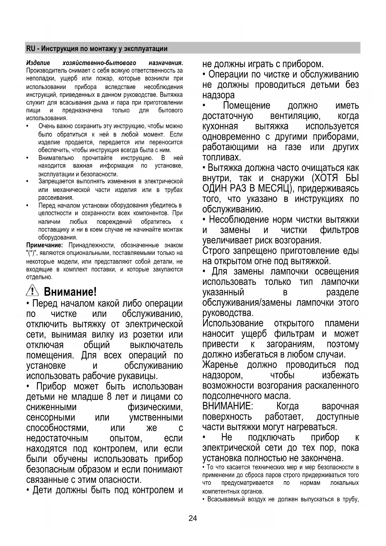- Вытяжка НИКОГДА не должна использоваться, как опорная поверхность, если только не указано иначе.