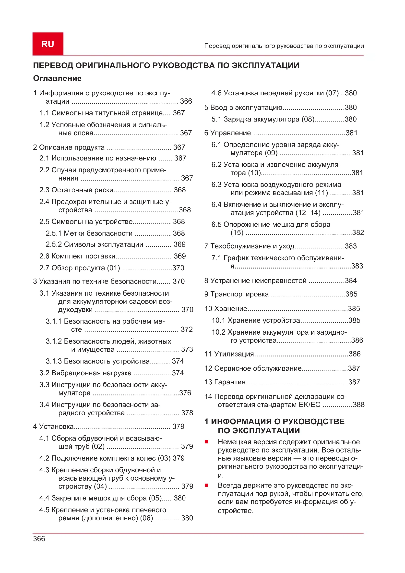 - 14 Перевод оригинальной декларации со- ответствия стандартам EK/ЕС 1 ИНФОРМАЦИЯ О РУКОВОДСТВЕ ПО ЭКСПЛУАТАЦИИ p. 388