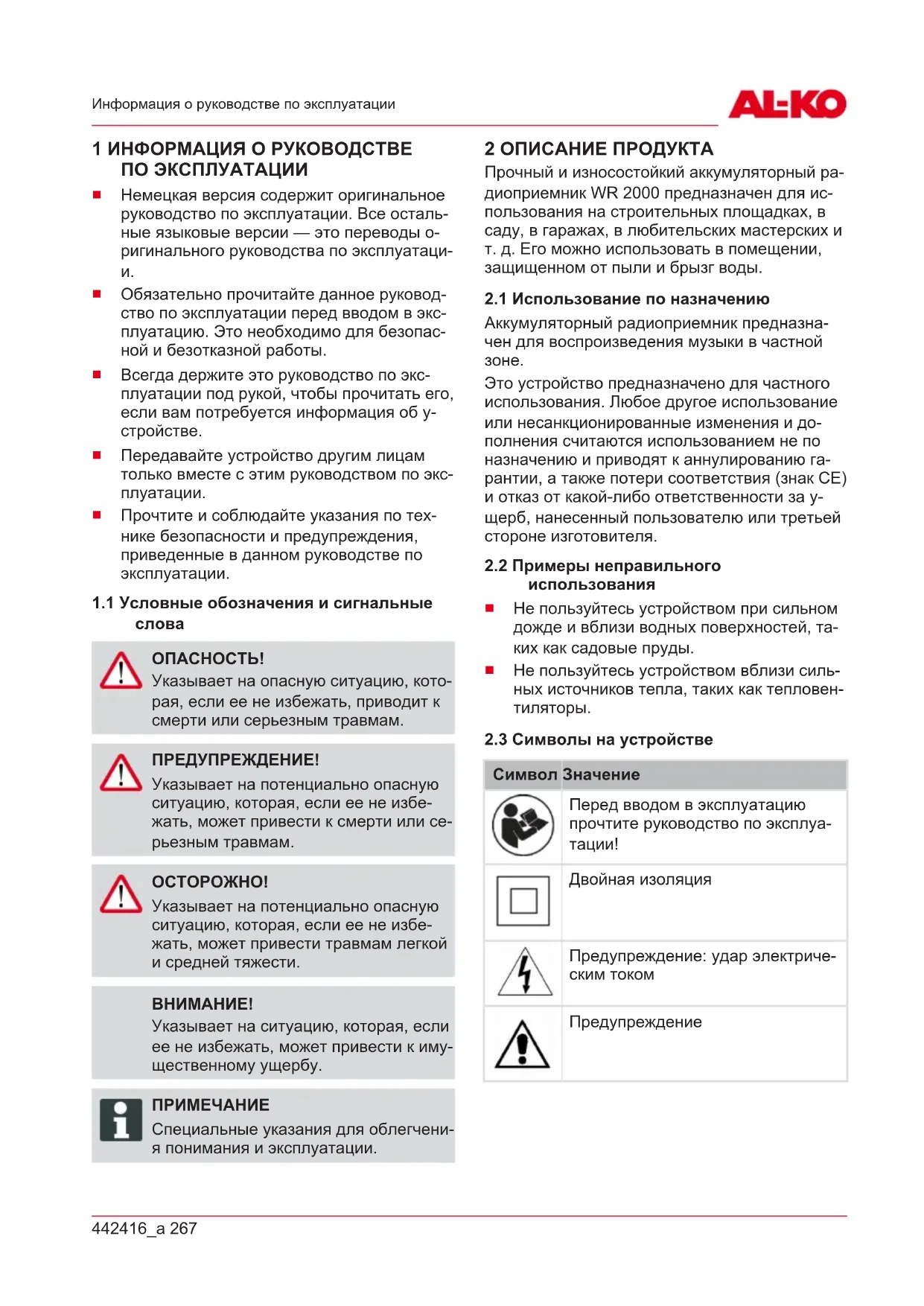 Скачайте инструкцию для вашего Радио в формате PDF бесплатно! Найдите своё руководство WR 2000 - AL-KO и возьмите своё электронное устройство обратно в руки. На этой странице опубликованы все документы, необходимые для использования вашего устройства. WR 2000 бренда AL-KO.