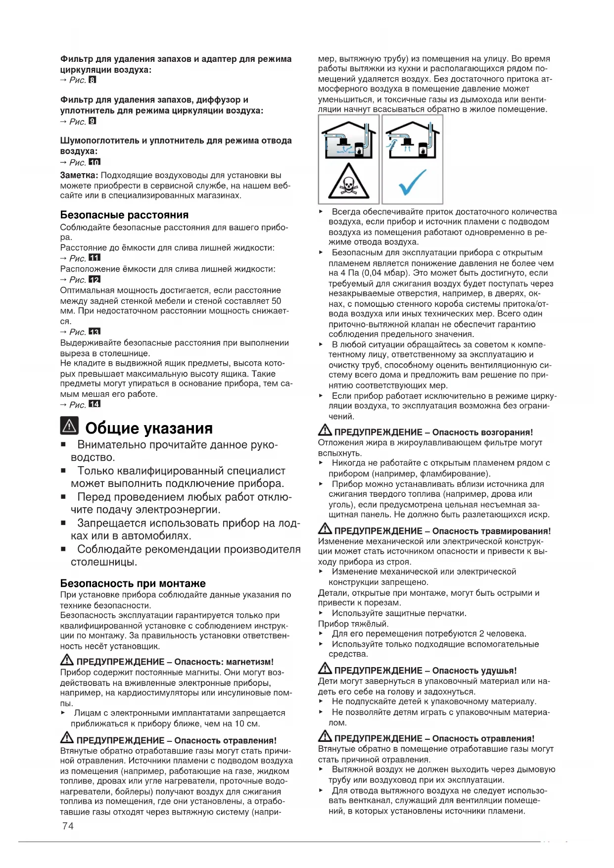 ¡ Только квалифицированный специалист может выполнить подключение прибора. ¡ Перед проведением любых работ отклю- чите подачу электроэнергии. ¡ Запрещается использовать прибор на лод- ках или в автомобилях. ¡ Соблюдайте рекомендации производителя столешницы. Безопасность при монтаже При установке прибора соблюдайте данные указания потехнике безопасности.Безопасность эксплуатации гарантируется только приквалифицированной установке с соблюдением инструк-ции по монтажу. За правильность установки ответствен-ность несёт установщик.ПРЕДУПРЕЖДЕНИЕ‒Опасность: магнетизм!Прибор содержит постоянные магниты. Они могут воз-действовать на вживленные электронные приборы,например, на кардиостимуляторы или инсулиновые пом- ▶ Лицам с электронными имплантатами запрещаетсяприближаться к прибору ближе, чем на 10см.ПРЕДУПРЕЖДЕНИЕ‒Опасность отравления!Втянутые обратно отработавшие газы могут стать причи-ной отравления. Источники пламени с подводом воздухаиз помещения (например, работающие на газе, жидкомтопливе, дровах или угле нагреватели, проточные водо-нагреватели, бойлеры) получают воздух для сжиганиятоплива из помещения, где они установлены, а отрабо-тавшие газы отходят через вытяжную систему (напри-мер, вытяжную трубу) из помещения на улицу. Во времяработы вытяжки из кухни и располагающихся рядом по-мещений удаляется воздух. Без достаточного притока ат-мосферного воздуха в помещение давление можетуменьшиться, и токсичные газы из дымохода или венти-ляции начнут всасываться обратно в жилое помещение. ▶ Всегда обеспечивайте приток достаточного количествавоздуха, если прибор и источник пламени с подводомвоздуха из помещения работают одновременно в ре-жиме отвода воздуха.▶ Безопасным для эксплуатации прибора с открытымпламенем является понижение давления не более чемна 4Па (0,04мбар). Это может быть достигнуто, еслитребуемый для сжигания воздух будет поступать черезнезакрываемые отверстия, например, в дверях, ок-нах, с помощью стенного короба системы притока/от-вода воздуха или иных технических мер. Всего одинприточно-вытяжной клапан не обеспечит гарантиюсоблюдения предельного значения.▶ В любой ситуации обращайтесь за советом к компе-тентному лицу, ответственному за эксплуатацию иочистку труб, способному оценить вентиляционную си-стему всего дома и предложить вам решение по при-нятию соответствующих мер.▶ Если прибор работает исключительно в режиме цирку-ляции воздуха, то эксплуатация возможна без ограни-чений.ПРЕДУПРЕЖДЕНИЕ‒Опасность возгорания!Отложения жира в жироулавливающем фильтре могутвспыхнуть.▶ Никогда не работайте с открытым пламенем рядом сприбором (например, фламбирование).▶ Прибор можно устанавливать вблизи источника длясжигания твердого топлива (например, дрова илиуголь), если предусмотрена цельная несъемная за-щитная панель. Не должно быть разлетающихся искр.ПРЕДУПРЕЖДЕНИЕ‒Опасность травмирования!Изменение механической или электрической конструк-ции может стать источником опасности и привести к вы-ходу прибора из строя.▶ Изменение механической или электрическойконструкции запрещено.Детали, открытые при монтаже, могут быть острыми ипривести к порезам.▶ Используйте защитные перчатки.Прибор тяжёлый.▶ Для его перемещения потребуются 2 человека.▶ Используйте только подходящие в
