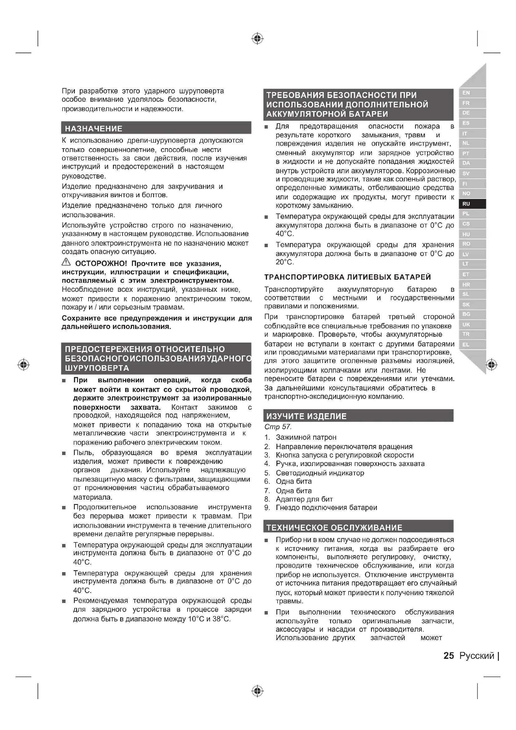 ■ Продолжительное использование инструмента без перерыва может привести к травмам. При использовании инструмента в течение длительного времени делайте регулярные перерывы. ■ Температура окружающей среды для эксплуатации инструмента должна быть в диапазоне от 0°C до 40°C. ■ Температура окружающей среды для хранения инструмента должна быть в диапазоне от 0°C до 40°C. ■ Рекомендуемая температура окружающей среды для зарядного устройства в процессе зарядки должна быть в диапазоне между 10°C и 38°C. ТРЕБОВАНИЯ БЕЗОПАСНОСТИ ПРИ ИСПОЛЬЗОВАНИИ ДОПОЛНИТЕЛЬНОЙ АККУМУЛЯТОРНОЙ БАТАРЕИ ■ Для предотвращения опасности пожара в результате короткого замыкания, травм и повреждения изделия не опускайте инструмент, сменный аккумулятор или зарядное устройство в жидкости и не допускайте попадания жидкостей внутрь устройств или аккумуляторов. Коррозионные и проводящие жидкости, такие как соленый раствор, определенные химикаты, отбеливающие средства или содержащие их продукты, могут привести к короткому замыканию. ■ Температура окружающей среды для эксплуатации аккумулятора должна быть в диапазоне от 0°C до 40°C. ■ Температура окружающей среды для хранения аккумулятора должна быть в диапазоне от 0°C до 20°C. ТРАНСПОРТИРОВКА ЛИТИЕВЫХ БАТАРЕЙ Транспортируйте аккумуляторную батарею в соответствии с местными и государственными правилами и положениями. При транспортировке батарей третьей стороной соблюдайте все специальные требования по упаковке и маркировке. Проверьте, чтобы аккумуляторные батареи не вступали в контакт с другими батареями или проводимыми материалами при транспортировке, для этого защитите оголенные разъемы изоляцией, изолирующими колпачками или лентами. Не переносите батареи с повреждениями или утечками. За дальнейшими консультациями обратитесь в транспортно-экспедиционную компанию. ИЗУЧИТЕ ИЗДЕЛИЕ Стр 57.