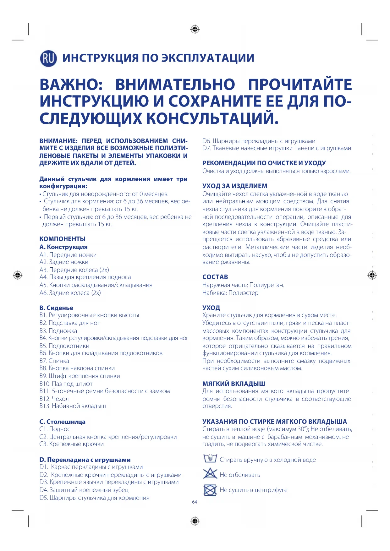 A. Конструкция A1. Передние ножки A2. Задние ножки A3. Передние колеса (2x) A4. Пазы для крепления подноса A5. Кнопки раскладывания/складывания A6. Задние колеса (2x) B. Сиденье B1. Регулировочные кнопки высоты B2. Подставка для ног B3. Подножка B4. Кнопки регулировки/складывания подставки для ног B5. Подлокотники B6. Кнопки для складывания подлокотников B7. Спинка B8. Кнопка наклона спинки B9. Штифт крепления спинки B10. Паз под штифт B11. 5-точечные ремни безопасности с замком B12. Чехол B13. Набивной вкладыш C. Столешница C1. Поднос C2. Центральная кнопка крепления/регулировки C3. Крепежные крючки D. Перекладина с игрушками D1. Каркас перкладины с игрушками D2. Крепежные крючки перекладины с игрушками D3. Крепежные язычки перекладины с игрушками D4. Защитный крепежный зубец D5. Шарниры стульчика для кормления D6. Шарниры перекладины с игрушками D7. Тканевые навесные игрушки панели с игрушками РЕКОМЕНДАЦИИ ПО ОЧИСТКЕ И УХОДУ Очистка и уход должны выполняться только взрослыми. УХОД ЗА ИЗДЕЛИЕМ Очищайте чехол слегка увлажненной в воде тканью или нейтральным моющим средством. Для снятия чехла стульчика для кормления повторите в обрат- ной последовательности операции, описанные для крепления чехла к конструкции. Очищайте пласти- ковые части слегка увлажненной в воде тканью. За- прещается использовать абразивные средства или растворители. Металлические части изделия необ- ходимо вытирать насухо, чтобы не допустить образо- вание ржавчины.