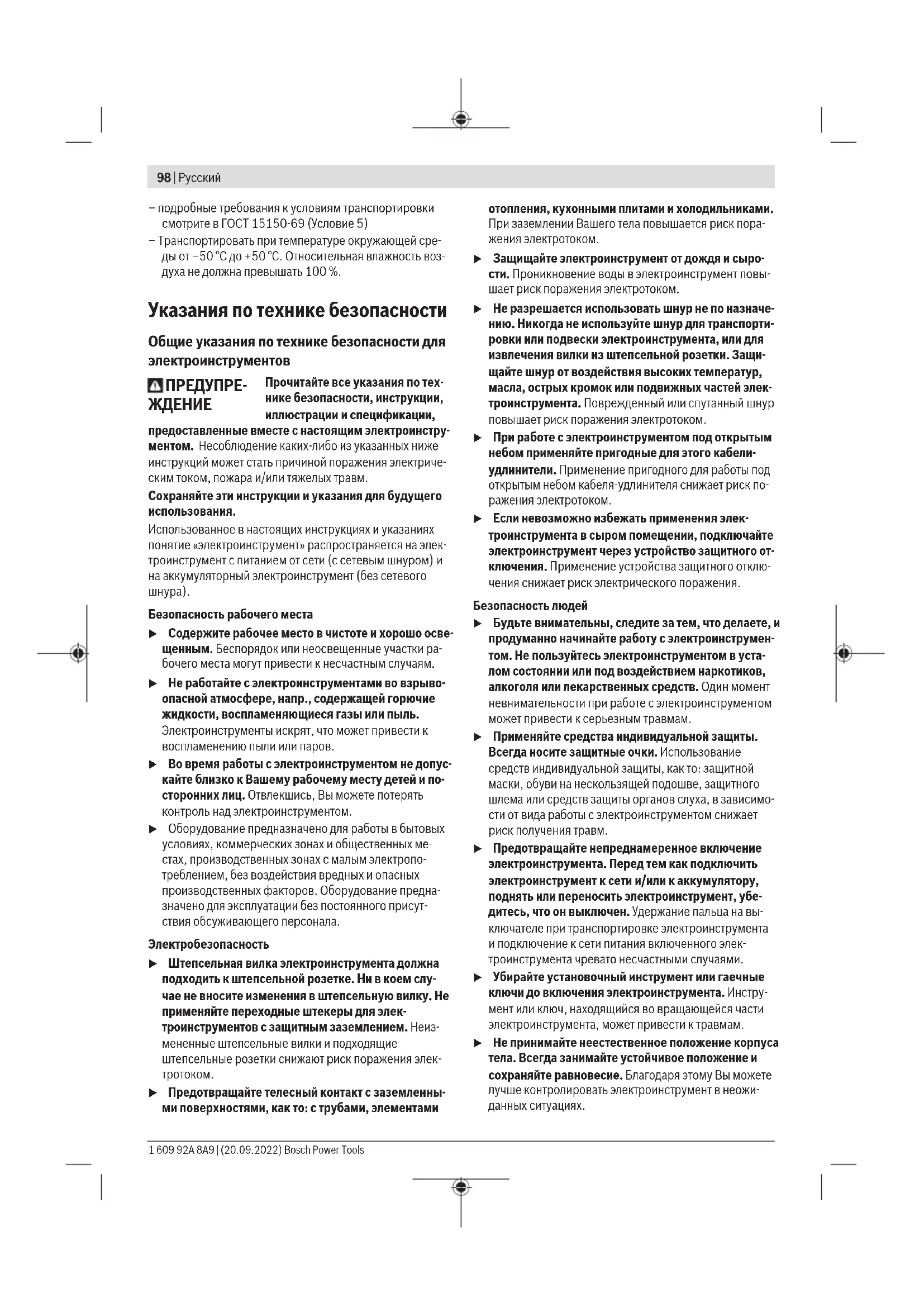 – при разгрузке/погрузке не допускается использова- ние любого вида техники, работающей по принципу зажима упаковки Bosch Power Tools 1 609 92A 8A9 | (20.09.2022)98 | Русский – подробные требования к условиям транспортировки смотрите в ГОСТ15150-69 (Условие5) – Транспортировать при температуре окружающей сре- ды от −50°С до +50°С. Относительная влажность воз- духа не должна превышать 100%. Указания по технике безопасности Общие указания по технике безопасности для электроинструментов
