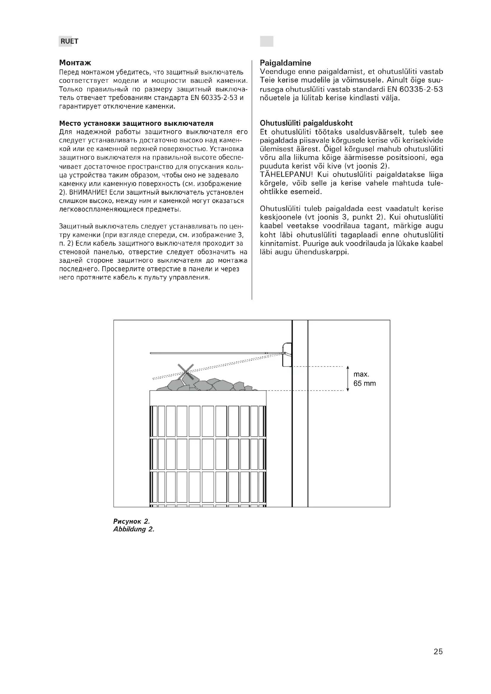 Перед монтажом убедитесь, что защитный выключатель соответствует модели и мощности вашей каменки. Только правильный по размеру защитный выключа- тель отвечает требованиям стандарта EN 60335-2-53 и гарантирует отключение каменки. Место установки защитного выключателя Для надежной работы защитного выключателя его следует устанавливать достаточно высоко над камен- кой или ее каменной верхней поверхностью. Установка защитного выключателя на правильной высоте обеспе- чивает достаточное пространство для опускания коль- ца устройства таким образом, чтобы оно не задевало каменку или каменную поверхность (см. изображение 2). ВНИМАНИЕ! Если защитный выключатель установлен слишком высоко, между ним и каменкой могут оказаться легковоспламеняющиеся предметы. Защитный выключатель следует устанавливать по цен- тру каменки (при взгляде спереди, см. изображение 3, п. 2) Если кабель защитного выключателя проходит за стеновой панелью, отверстие следует обозначить на задней стороне защитного выключателя до монтажа последнего. Просверлите отверстие в панели и через него протяните кабель к пульту управления. max. 65 mm Рисунок 2. Abbildung 2. Paigaldamine Veenduge enne paigaldamist, et ohutuslüliti vastab Teie kerise mudelile ja võimsusele. Ainult õige suu- rusega ohutuslüliti vastab standardi EN 60335-2-53 nõuetele ja lülitab kerise kindlasti välja. Ohutuslüliti paigalduskoht Et ohutuslüliti töötaks usaldusväärselt, tuleb see paigaldada piisavale kõrgusele kerise või kerisekivide ülemisest äärest. Õigel kõrgusel mahub ohutuslüliti võru alla liikuma kõige äärmisesse positsiooni, ega puuduta kerist või kive (vt joonis 2). TÄHELEPANU! Kui ohutuslüliti paigaldatakse liiga kõrgele, võib selle ja kerise vahele mahtuda tule- ohtlikke esemeid. Ohutuslüliti tuleb paigaldada eest vaadatult kerise keskjoonele (vt joonis 3, punkt 2). Kui ohutuslüliti kaabel veetakse voodrilaua tagant, märkige augu koht läbi ohutuslüliti tagaplaadi enne ohutuslüliti kinnitamist. Puurige auk voodrilauda ja lükake kaabel läbi augu ühenduskarppi.RU ET Крепление защитного выключателяСм. изображение 3. Ohutuslüliti kinnitamine Vaata joonis 3.
